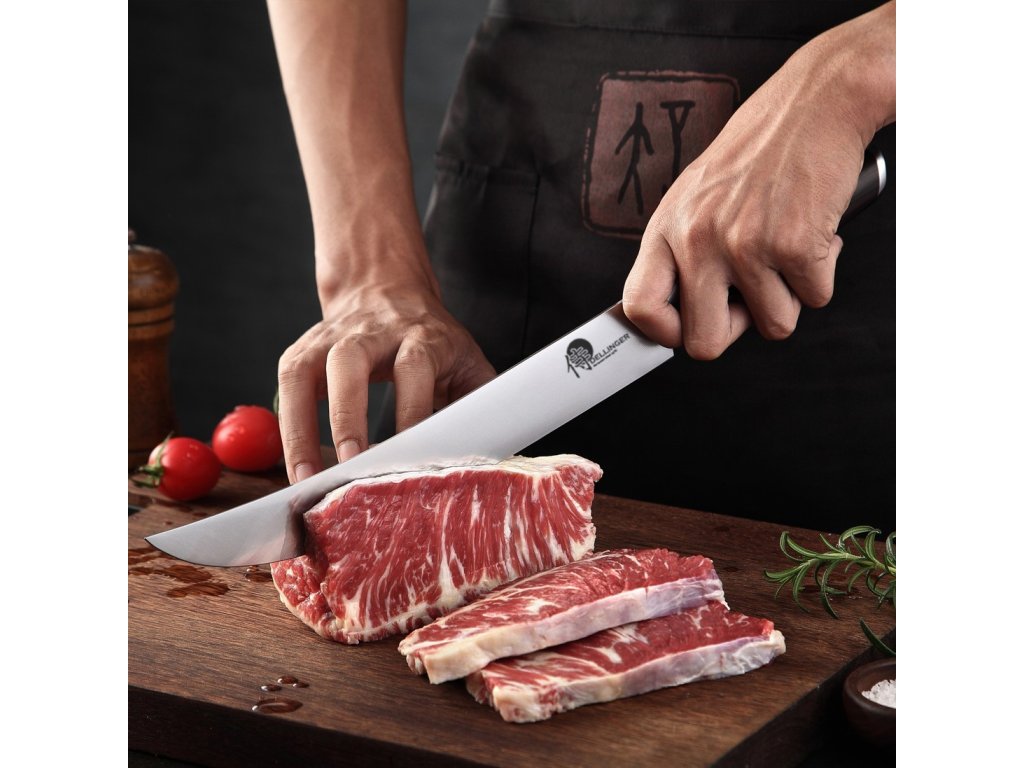 Velmi ostrý plátkovací nůž Dellinger BBQ Carve z německé nerezové oceli 1.4116 s působivým designem a nejvyšší kvalitou. Zajistěte, aby každá krůta, každá pečeně nebo šunka byly dokonale nakrájené. Pokud patříte k milovníkům hovězího carpaccia, měl by se tento nůž stát povinnou výbavou vaší kuchyně. Dlouhá čepel a rukojeť západního stylu vám poskytnou nejlepší kontrolu při řezání a krájení.