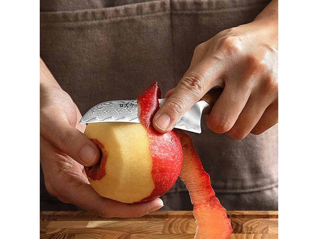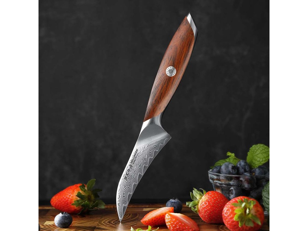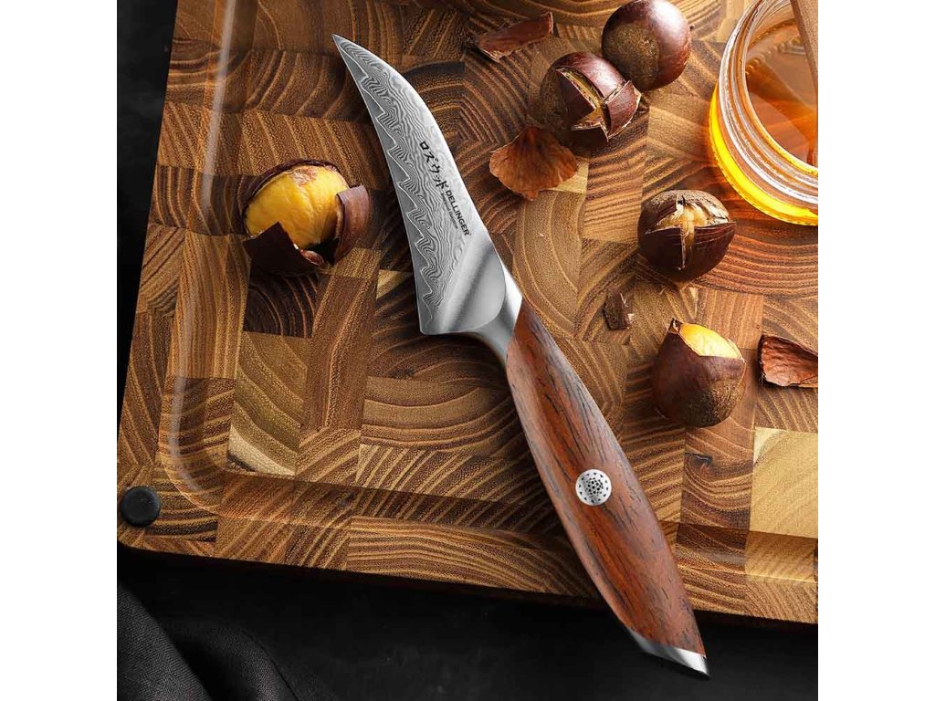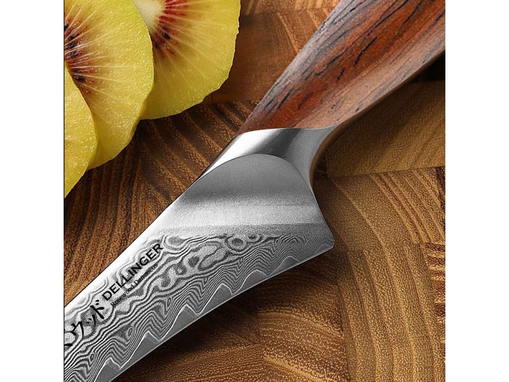 Nůž loupací Paring ze série Dellinger Rose Wood Damascus s damaškovou čepelí a jádrem z oceli VG-10. Tvrdost jádra 61 HRC. Rukojeť západního typu je vyrobena z luxusního dřeva Rose-Wood. Dokonalý pomocník pro každodenní loupání ovoce a zeleniny. Délka čepele 100 mm.