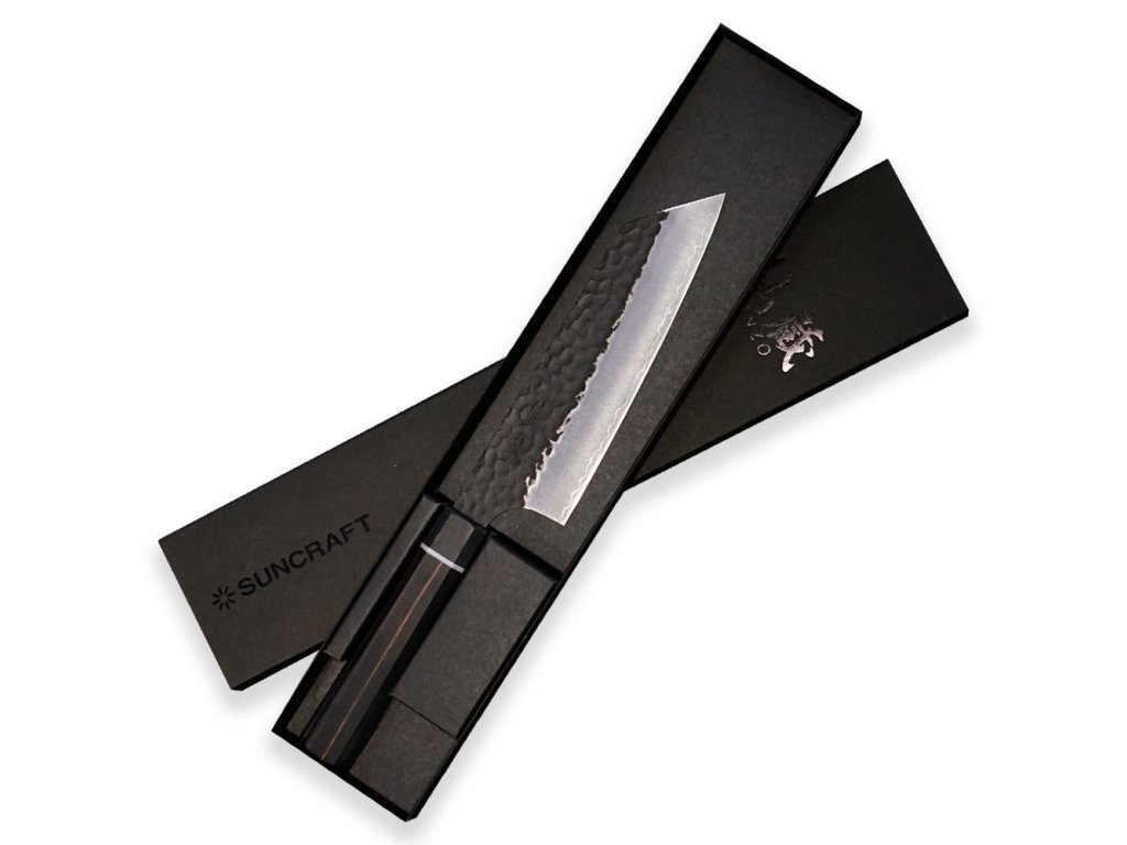 Inovativní a propracované nože ze série Suncraft Senzo Finest SPG STRIX® jsou vhodné jak pro praváky, tak pro leváky. Každý kuchař, ať už profesionál nebo nadšený amatér ocení tvrdost jádra 65 HRC a tradiční černý "Kurouchi" finiš s efektem Tsuchime (kladívková úprava). Tento povrch dodává noži jedinečný rustikální vzhled, ale zároveň pomáhá snižovat tření a zabraňuje přilepení krájených surovin k čepeli.