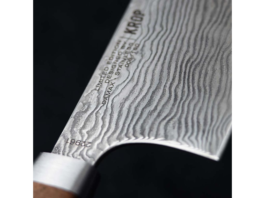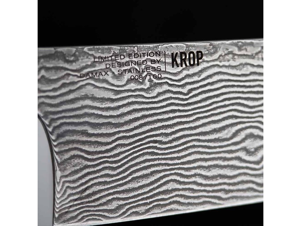 Nože Handmade KROP Damax jsou vybaveny čepelí z prémiové nerezové damaškové oceli DAMAX™, která se vyznačuje vysokou tvrdostí, dlouhou trvanlivostí ostří a vynikající odolností proti korozi. Díky těmto vlastnostem je ideální pro profesionální kuchyňské nože, outdoorové modely i exkluzivní limitované edice.