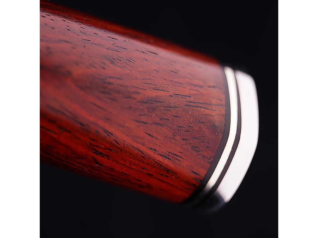 Rukojeť je vyrobena z exotického dřeva Cocobolo, které se pyšní nádhernou kresbou a vysokou hustotou. Tento prémiový materiál je přirozeně odolný vůči vlhkosti a praskání díky obsaženým přírodním olejům. Tvar rukojeti ve stylu písmene „D“ je navržen pro ergonomický úchop, který zajišťuje pohodlí a maximální kontrolu při práci. Asymetrické zakřivení rukojeti skvěle padne do ruky a ocení jej praváci i leváci.
