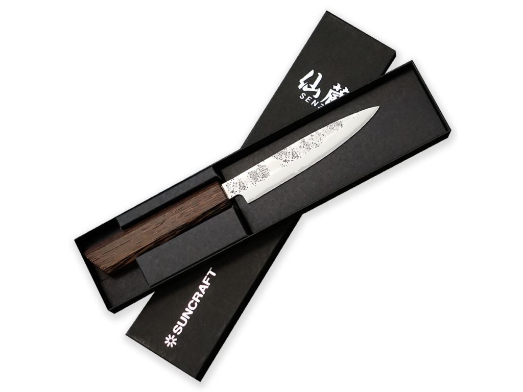 Nůž loupací Utility ze série Suncraft Senzo Retro® s 3 vrstvou čepelí a jádrem z oceli . Tvrdost jádra 60 HRC. Osmihranná rukojeť z přírodního wengé dřeva. Dokonalý pomocník pro každodenní loupání ovoce a zeleniny. Délka čepele 120 mm.