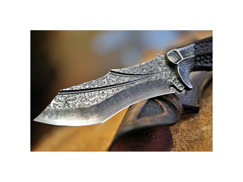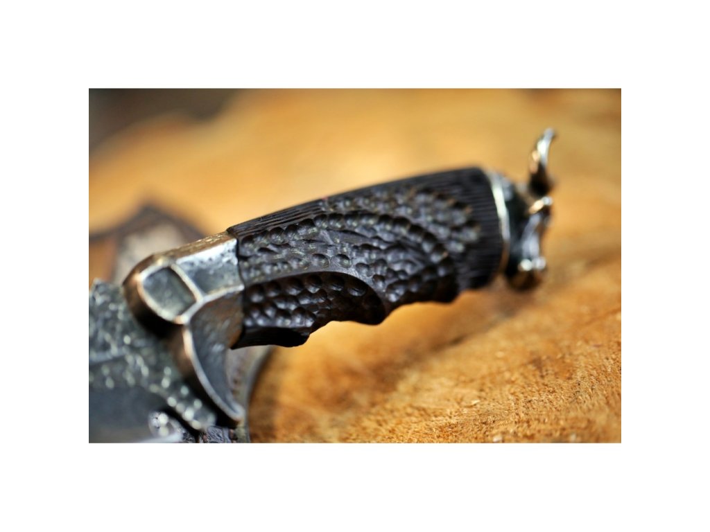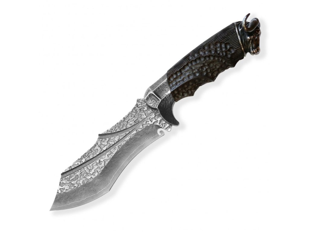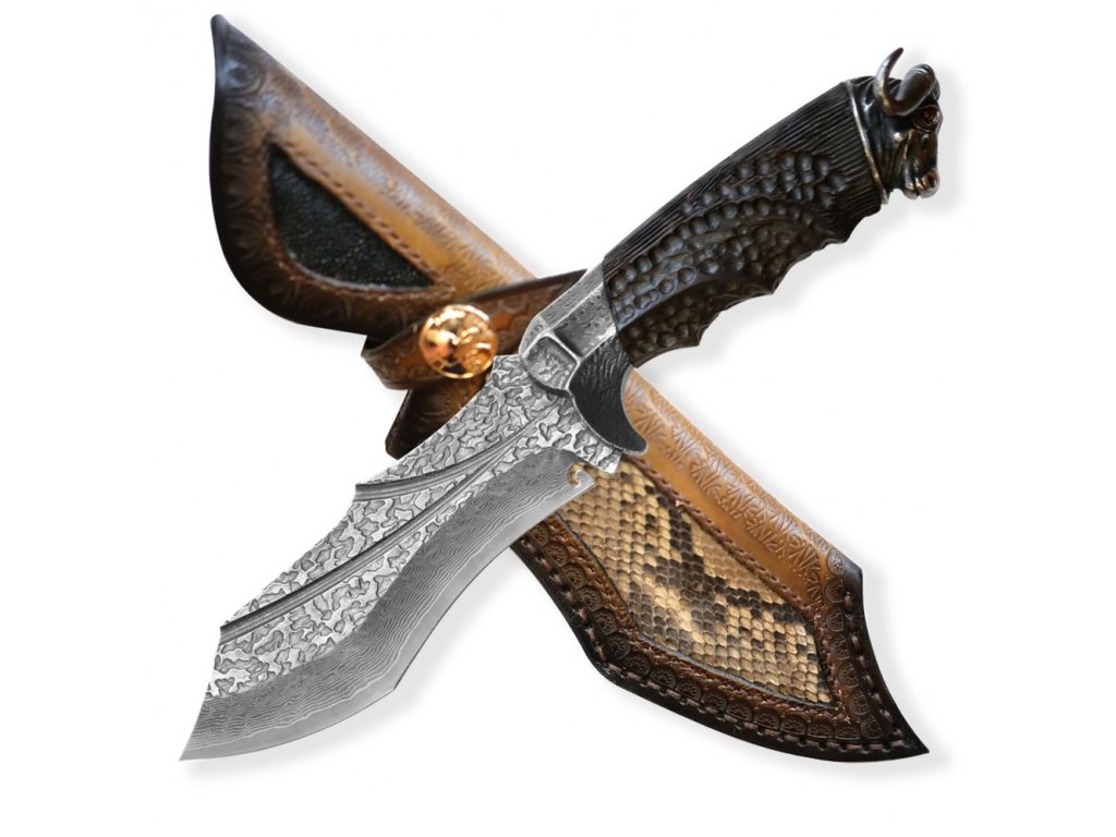 Masivní nůž s čepelí z nerezové damaškové oceli s povrchovou úpravou black coating, tvrdost 61 HRC, zaujme nejen výkonem, ale i originálním zpracováním. Rukojeť z mahagonového dřeva zakončená detailní hlavou býka padne do silné velké ruky. Součástí je kožené pouzdro s hadí kůží. Výjimečný kousek pro sběratele i lovce.