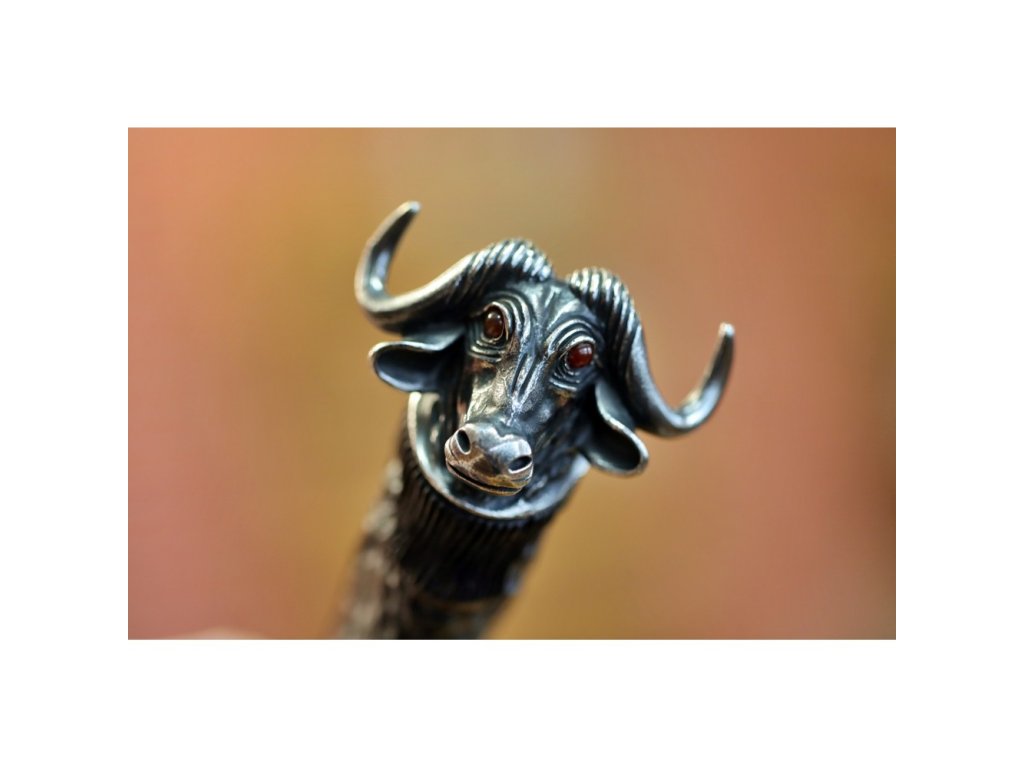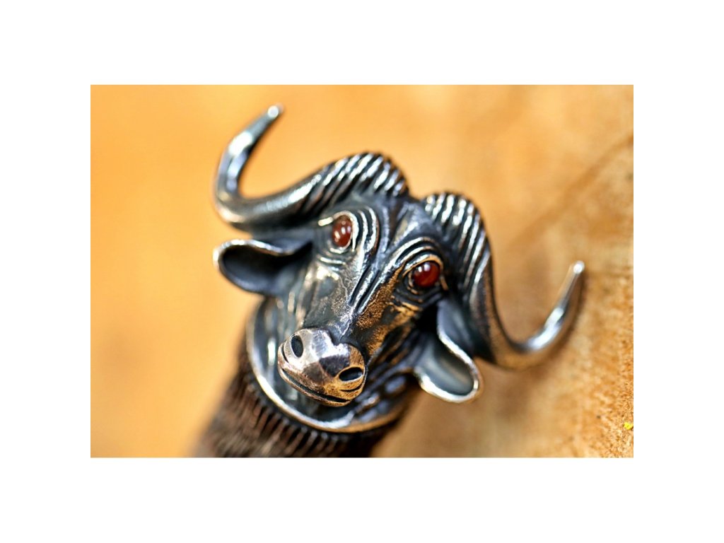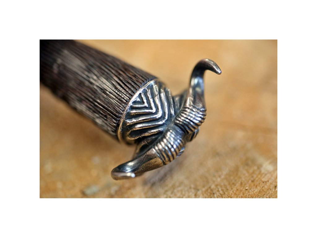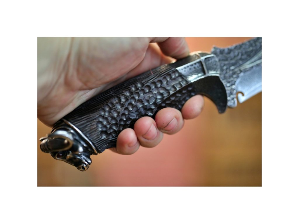 Masivní nůž s čepelí z nerezové damaškové oceli s povrchovou úpravou black coating, tvrdost 61 HRC, zaujme nejen výkonem, ale i originálním zpracováním. Rukojeť z mahagonového dřeva zakončená detailní hlavou býka padne do silné velké ruky. Součástí je kožené pouzdro s hadí kůží. Výjimečný kousek pro sběratele i lovce.