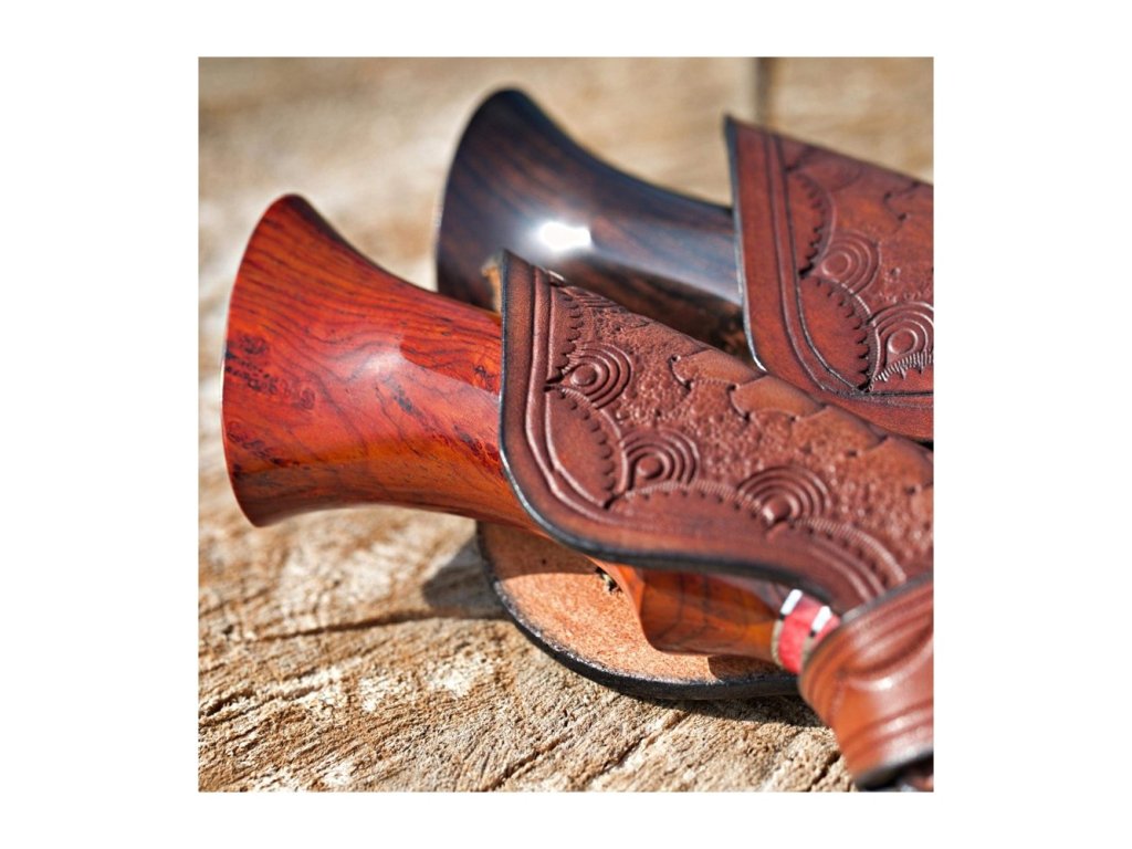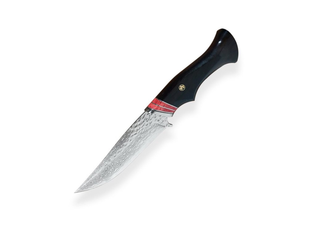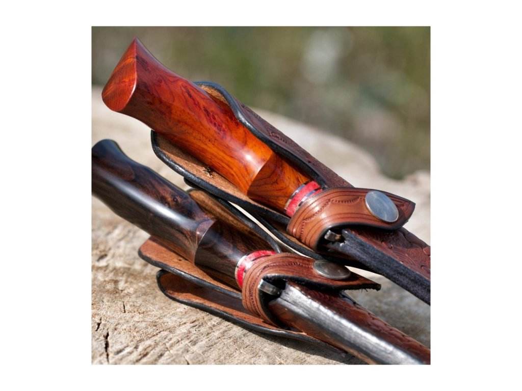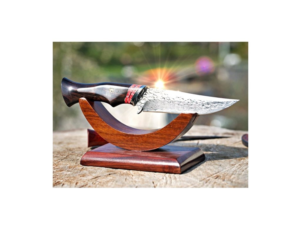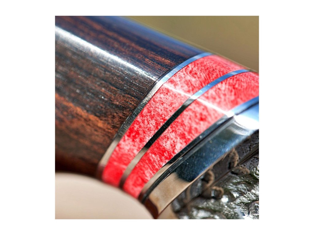 Rukojeť je z exotického ebenového dřeva v kombinaci s červenou velbloudí kostí. Ebenové dřevo vyniká svojí odolností a krásnou tmavou až černou barvou. Rukojeť má tvar, který ideálně padne do každé ruky. Pouzdro je vyrobené z kvalitní argentinské hovězí kůže se zajímavým motivem.
