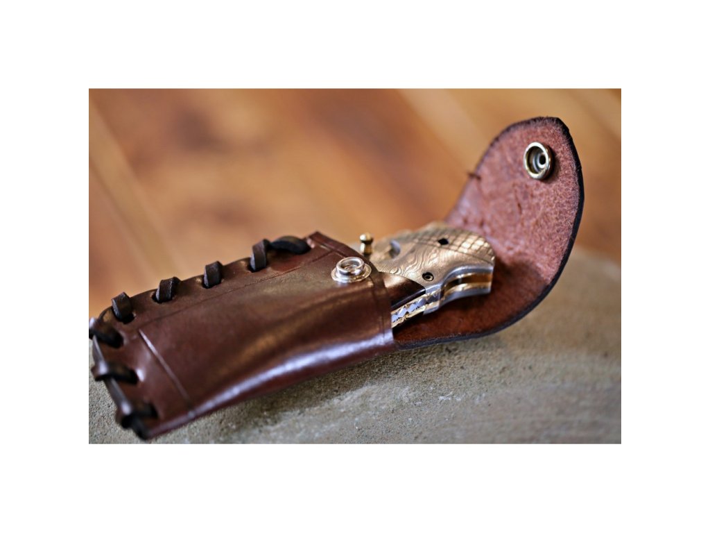 Zavírací nůž Dellinger Schnabel s čepelí z damaškové uhlíkové oceli a rukojetí z mosazi a barvené velbloudí kosti, s masivním damaškovým kováním s rytým vzorem. Dodává se s koženým pouzdrem.