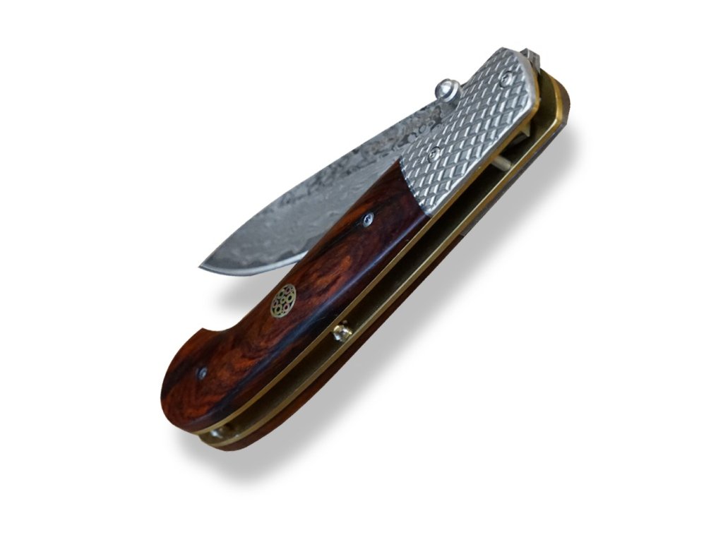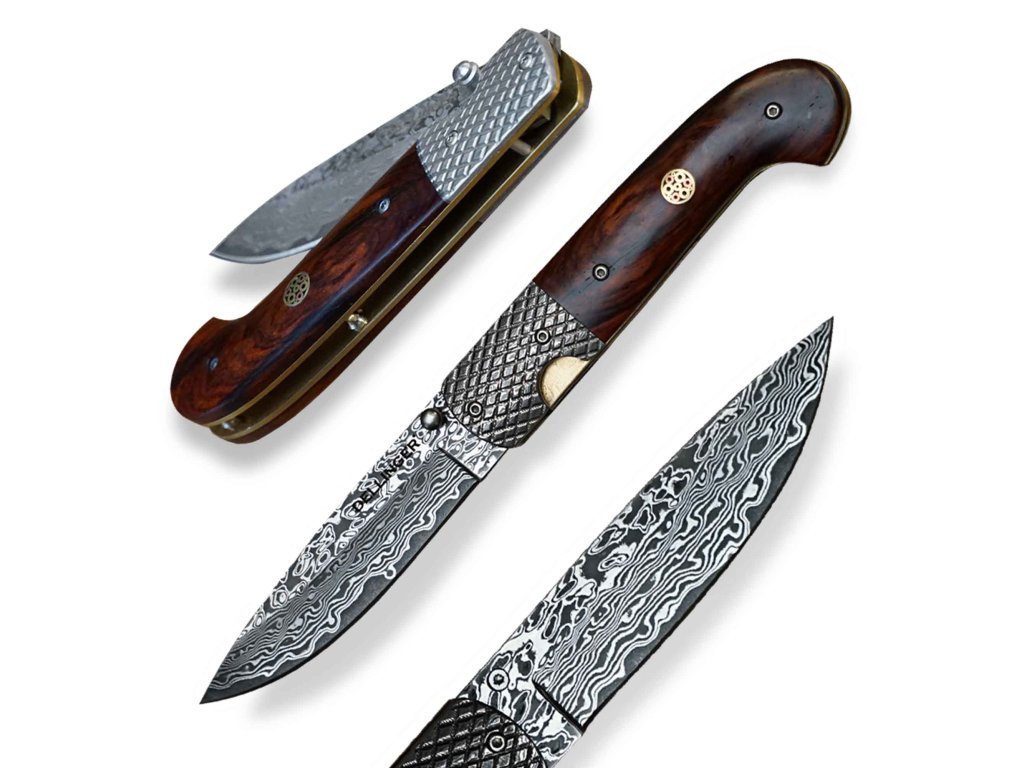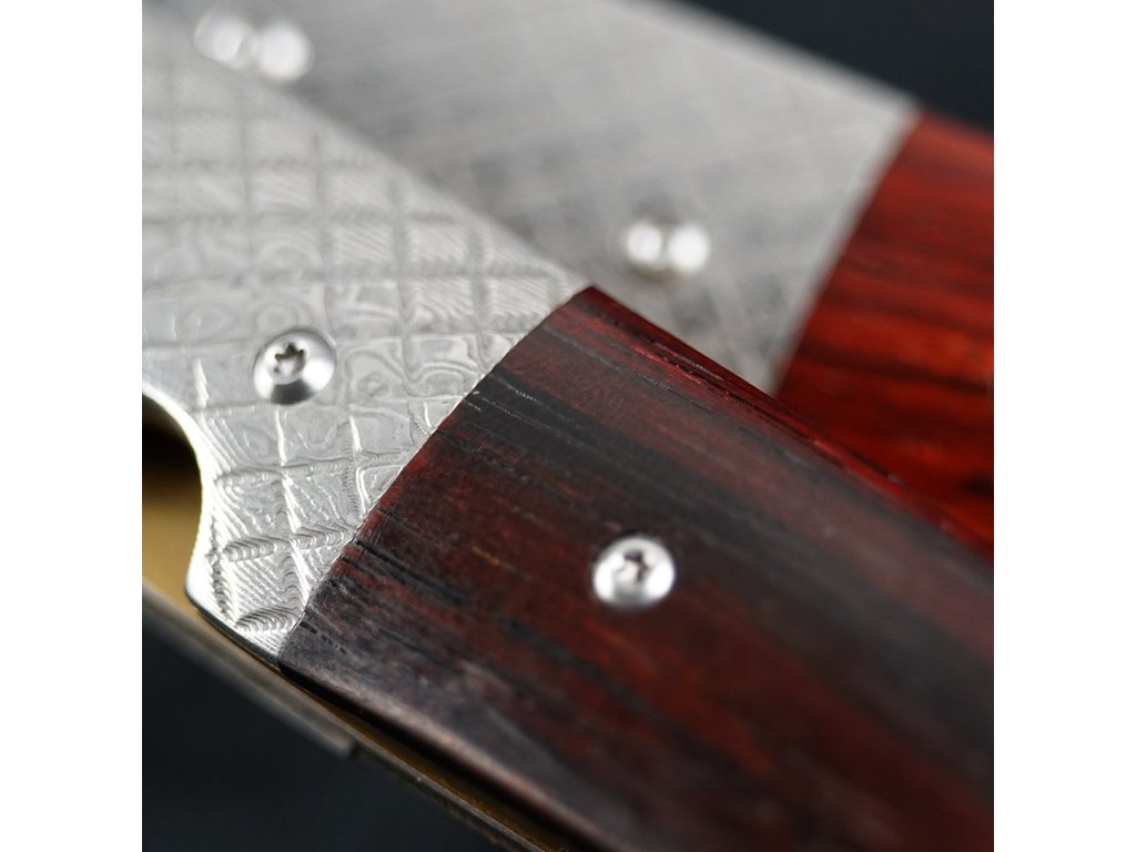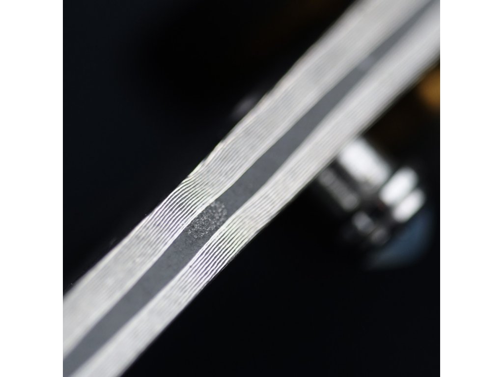 Stylový damaškový kapesní nůž Dellinger Sisso Sentinell s čepelí s jádrem z japonské oceli VG-10, tvrdost okolo 60 HRC, vloženým mezi 66 vrstev 2 nerezových damaškových ocelí. Střenky nože jsou z exotického palisandru s masivním damaškovým kováním. Čepel je zajištěna pojistkou Liner-Lock. Nůž je skvělý do lesa i na práci v přírodě.
