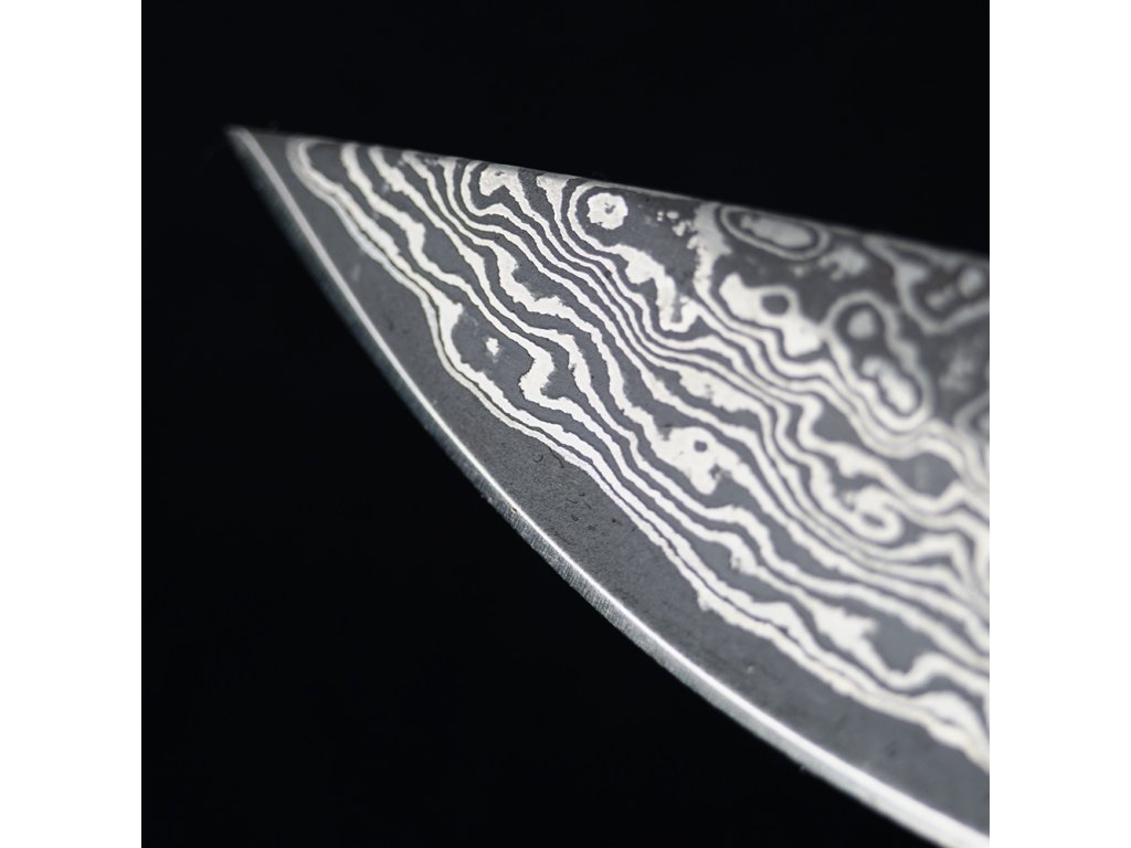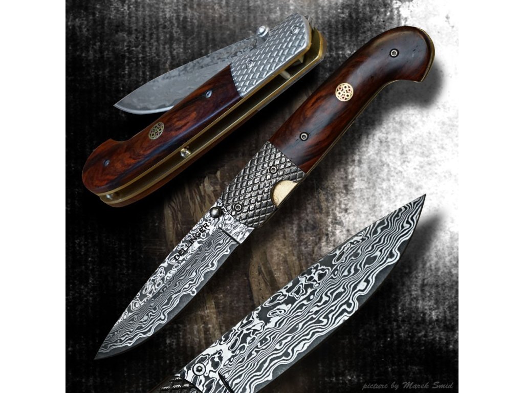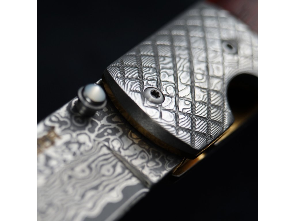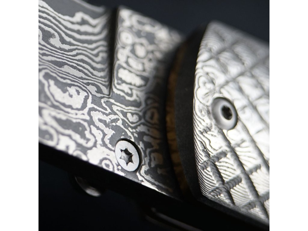 Stylový damaškový kapesní nůž Dellinger Sisso Sentinell s čepelí s jádrem z japonské oceli VG-10, tvrdost okolo 60 HRC, vloženým mezi 66 vrstev 2 nerezových damaškových ocelí. Střenky nože jsou z exotického palisandru s masivním damaškovým kováním. Čepel je zajištěna pojistkou Liner-Lock. Nůž je skvělý do lesa i na práci v přírodě.