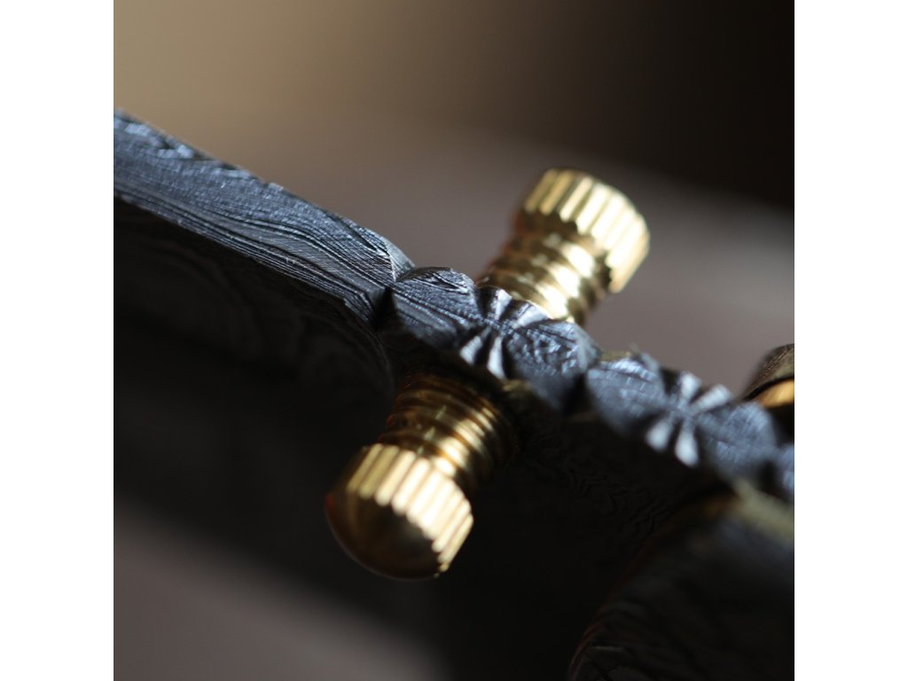 Lovecký damaškový nůž Dellinger Tanto Obsidian Wenge s čepelí z damaškové uhlíkové oceli a rukojetí z kartáčovaného dřeva wenge a mosazi, s masivním žebrovaným damaškovým kováním. Dodává se s koženým pouzdrem.