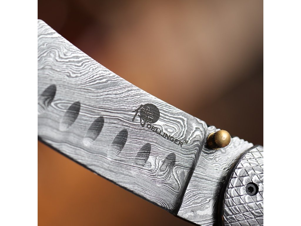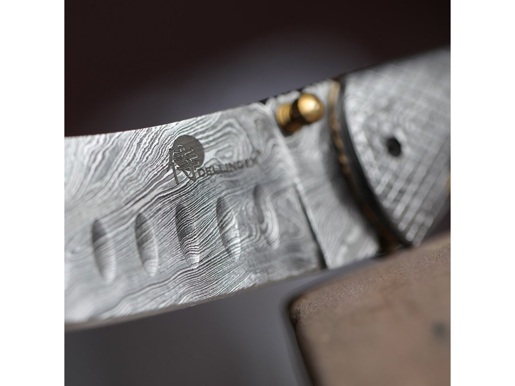 Nůž Dellinger Tanto Obsidian Wenge je kapesní nůž pro každodenní použití. Čepel tohoto nože je vyrobena z damaškové uhlíkové oceli, kdy vyšší obsah uhlíku přispívá k její větší tvrdosti a odolnosti materiálu, snáze se brousí. Nůž není nerezový, proto je nutné o čepel více pečovat. Pravidelná údržba, včetně vytření do sucha po použití a následné naolejování, minimalizuje riziko koroze. Nůž má rukojeť z kartáčovaného dřeva wenge doplněné masivním kováním z uhlíkové damaškové oceli, což mu dodává velmi originální vzhled. Tento praktický zavírák poskytuje spolehlivý výkon a usnadňuje širokou škálu pracovních úkolů. Čepel se otevírá za pomoci čepu a teflonových podložek a je pevně zajištěna pojistkou liner lock proti samovolnému zavření. Nůž je dodávaný v koženém pouzdru.