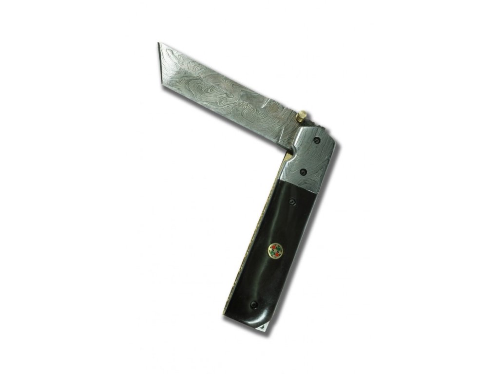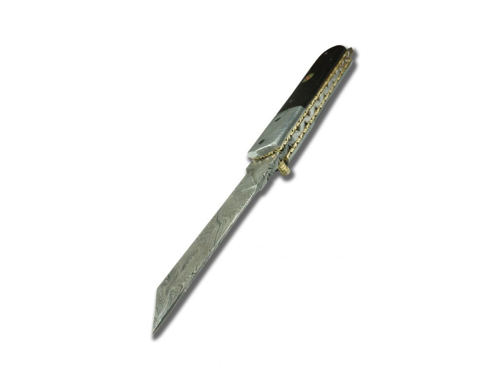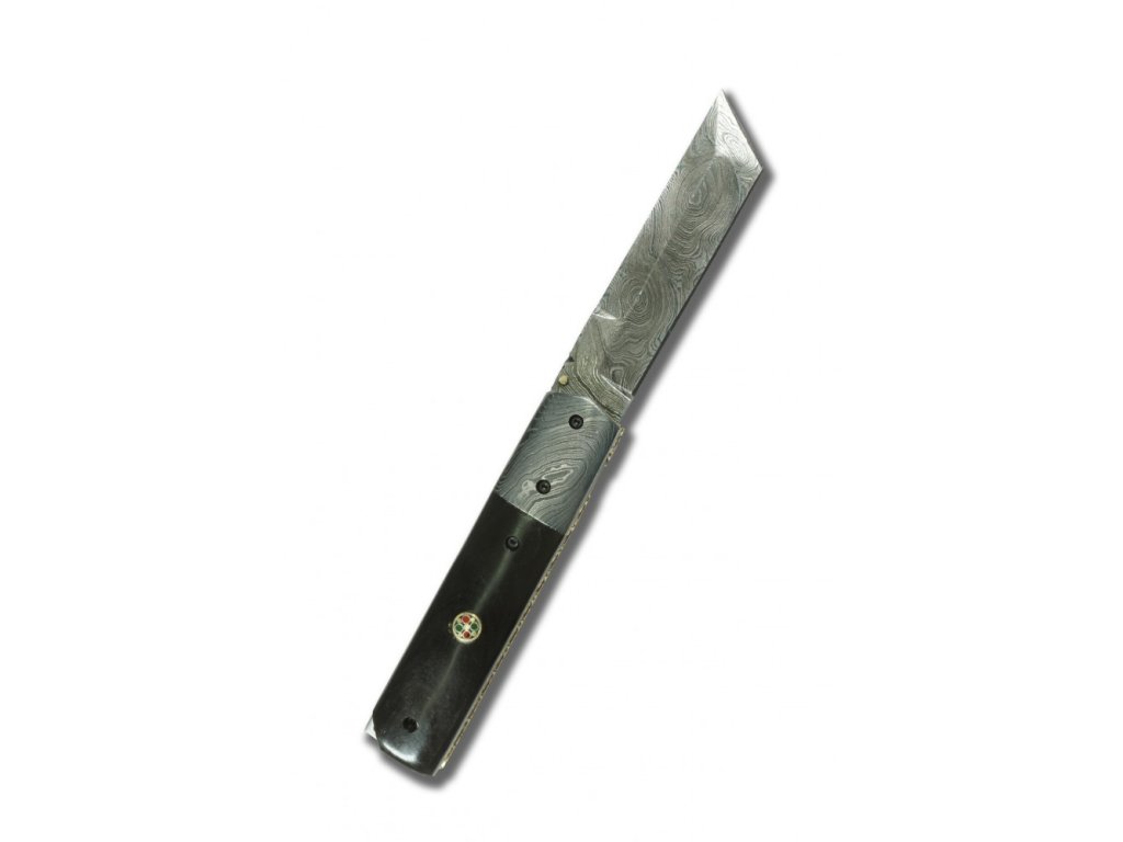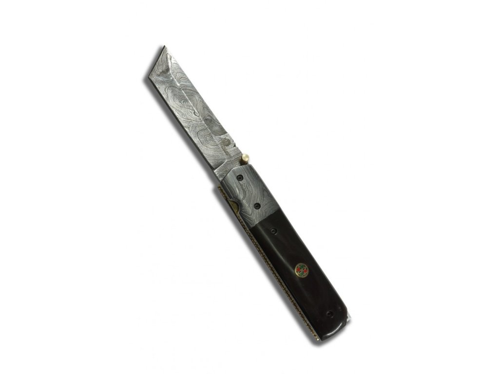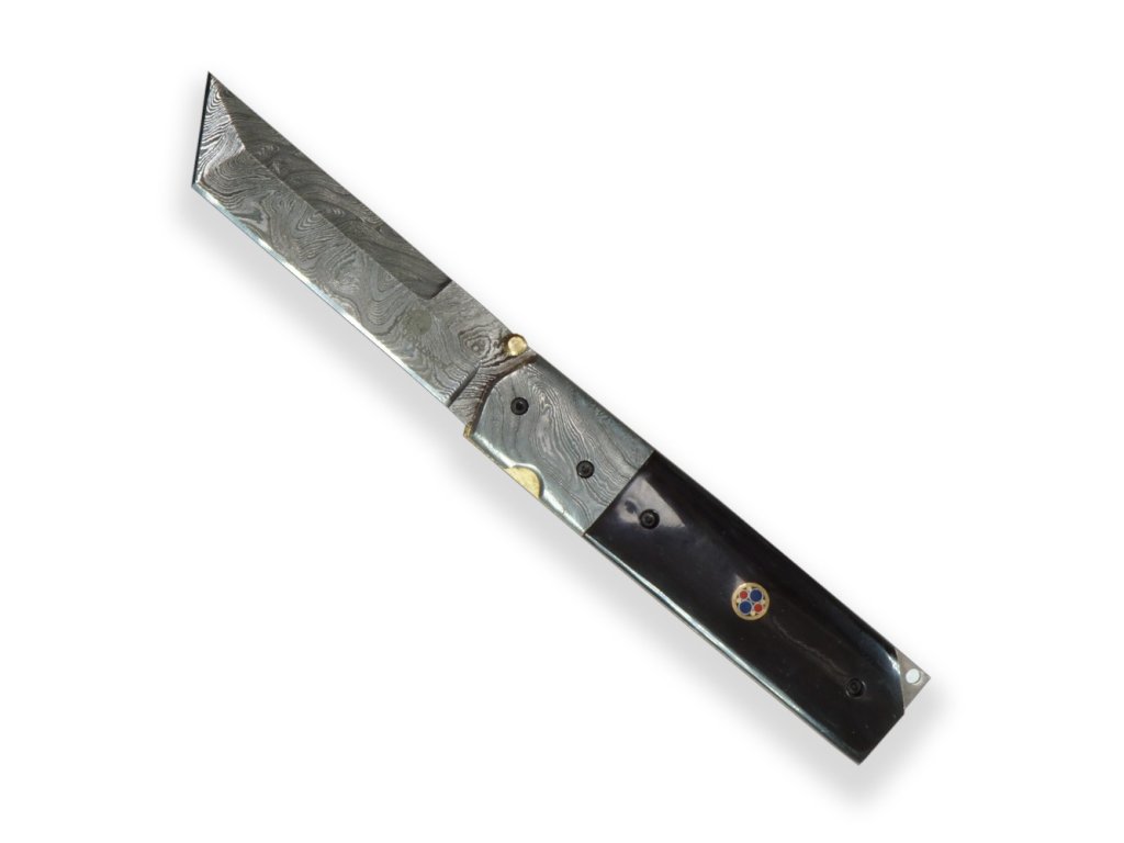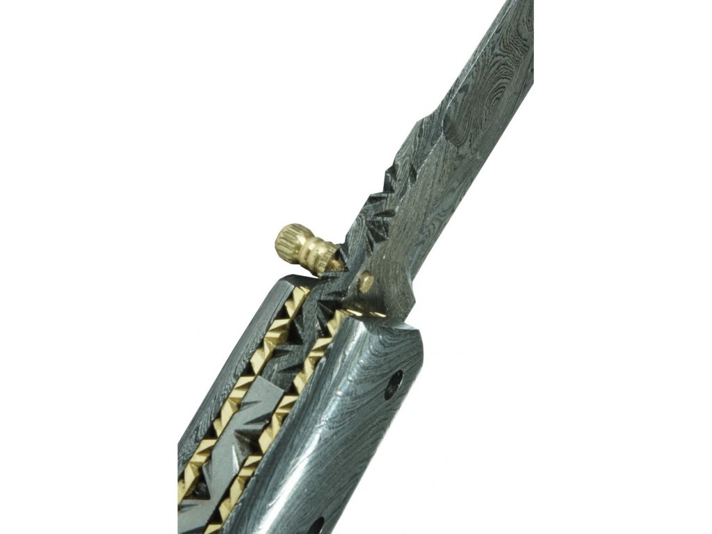 Elegantní zavírací nůž pro každodenní nošení. Čepel tohoto nože je vyrobena z damaškové uhlíkové oceli a dosahuje tvrdosti 60 HRC. Kresba vytvořená na povrchu čepeli je jedinečná a vyniká hloubkou profilu jednotlivých vrstev. Má ostrou špičku a čepel typu tanto. Houževnatost a odolnost vůči opotřebení je samozřejmostí. Damašková uhlíková ocel není nerezová a proto vykazuje určitou citlivost na oxidaci. Pravidelná údržba, včetně olejování a udržování sucha, může pomoci minimalizovat riziko koroze. Nůž má střenky z rohoviny, masivní kování z uhlíkové damaškové oceli a mosazné příložky, což mu dodává luxusní a originální vzhled. Ohromující kombinace, která zaujme na první pohled. Tento praktický zavírák poskytuje spolehlivý výkon a usnadňuje širokou škálu pracovních úkolů. Čepel je pevně zajištěna pojistkou Liner-Lock proti samovolnému zavření. Nůž je dodávaný v koženém pouzdru.