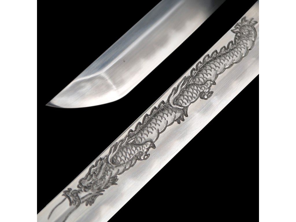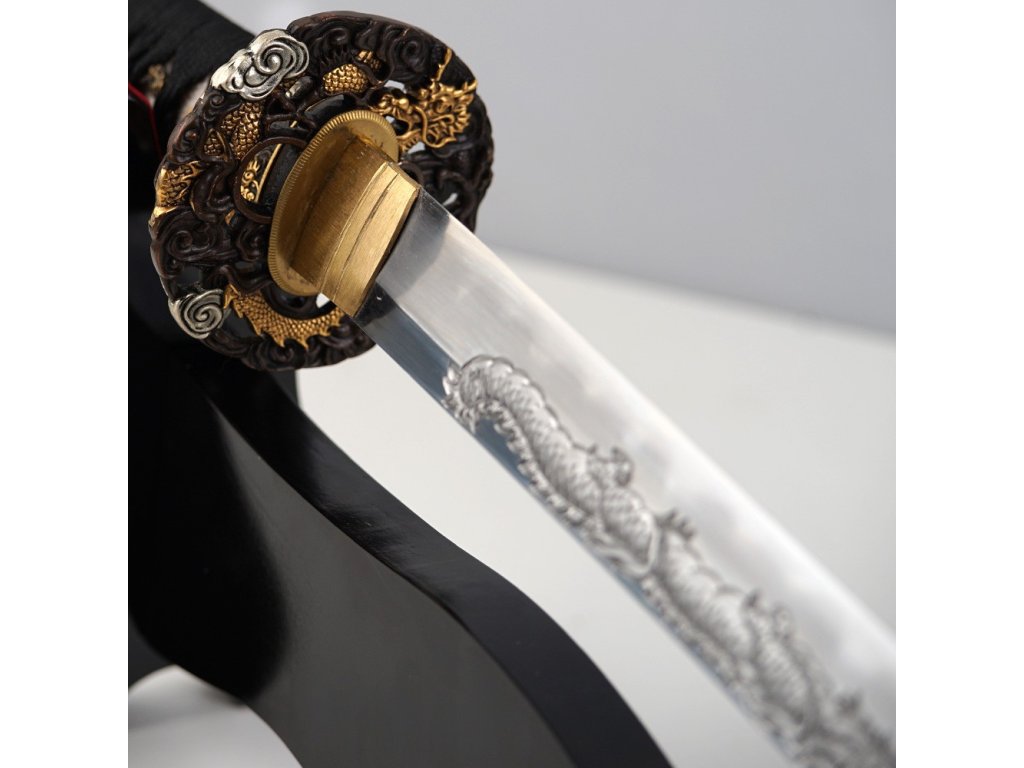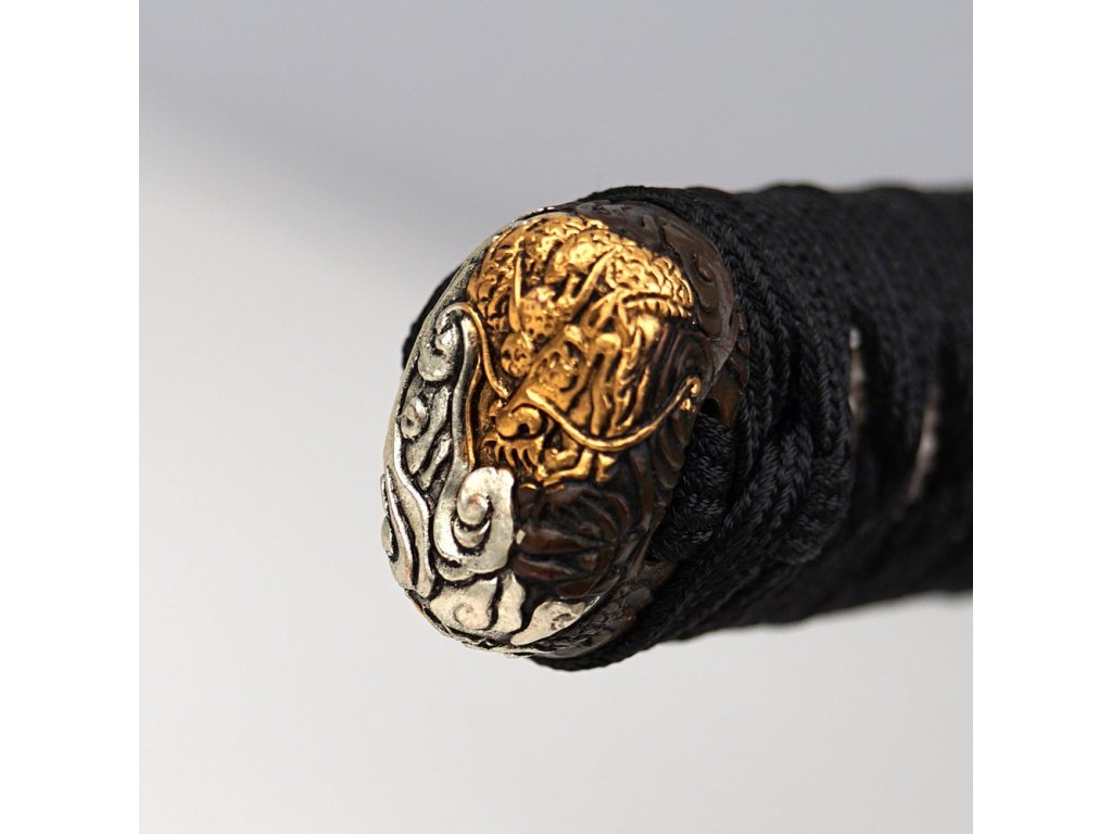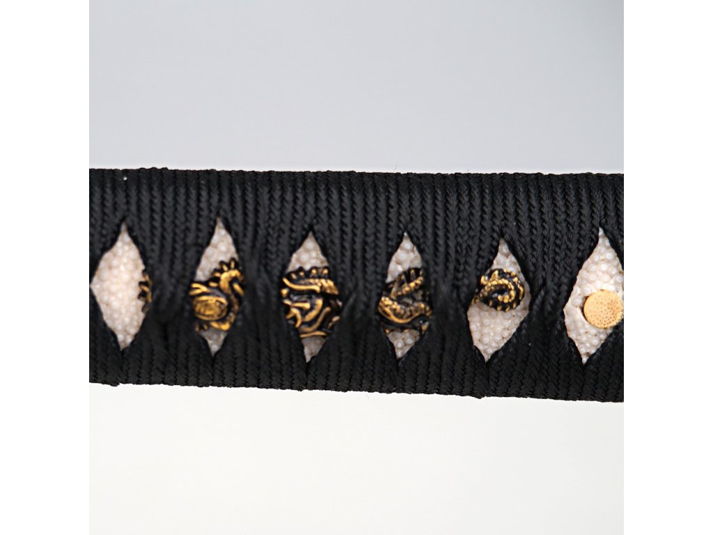 Prémiová replika meče katana Doragon s čepelí o délce Nagasa 2,30 Shaku (69,8 cm) z uhlíkové oceli T-10, tvrdost ostří hasaki 58 HRC. Kalená čepel se skutečným hamonem Gunome je zdobena horimono draka, hrot Chu Kissaki a Diamond Shape Yokote. Elegantní lesklá černá saya s černobílým opletem, na koiguchi, kurigatě a kojiri je použitý buvolí roh. Rukojeť s pravou rejnočí kůží. Dodáváno v plátěném vaku a krabici.