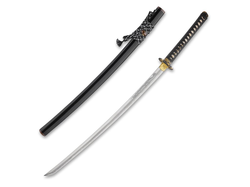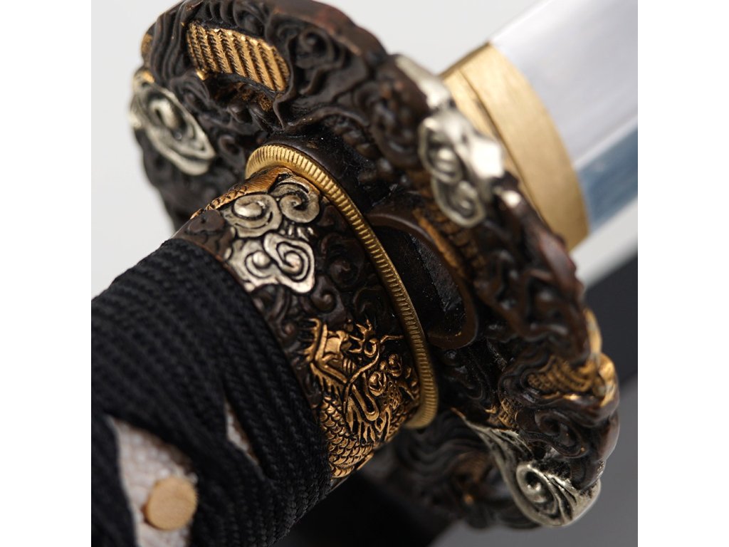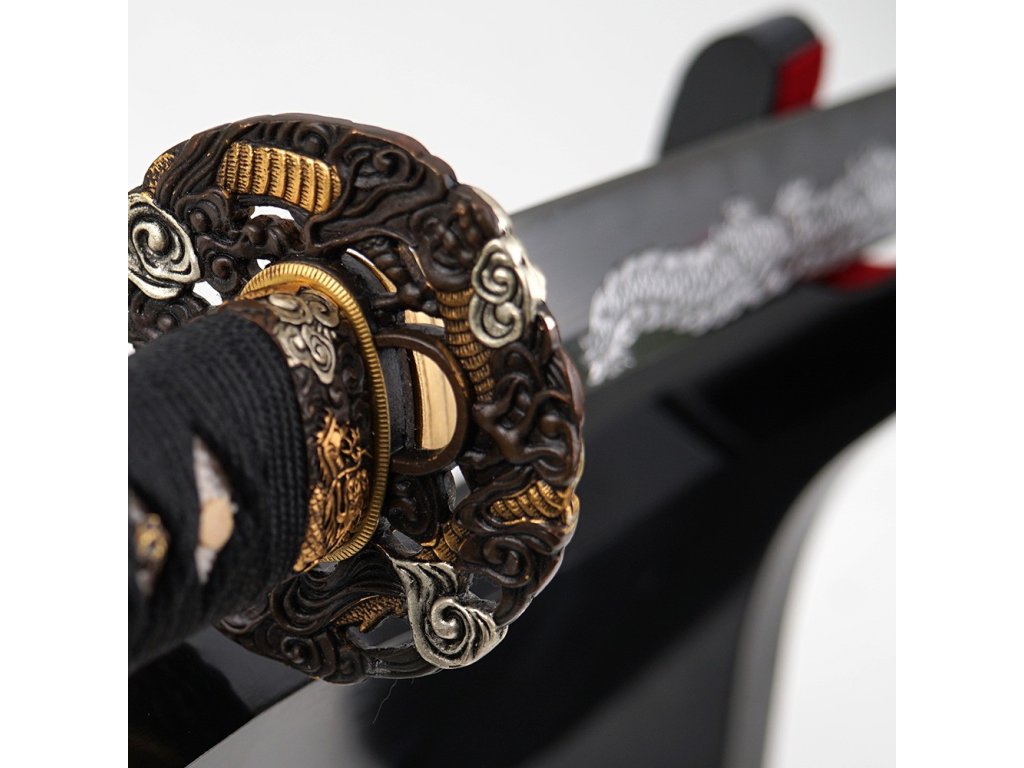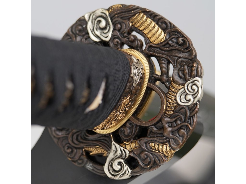 Prémiová replika meče katana Doragon s čepelí o délce Nagasa 2,30 Shaku (69,8 cm) z uhlíkové oceli T-10, tvrdost ostří hasaki 58 HRC. Kalená čepel se skutečným hamonem Gunome je zdobena horimono draka, hrot Chu Kissaki a Diamond Shape Yokote. Elegantní lesklá černá saya s černobílým opletem, na koiguchi, kurigatě a kojiri je použitý buvolí roh. Rukojeť s pravou rejnočí kůží. Dodáváno v plátěném vaku a krabici.