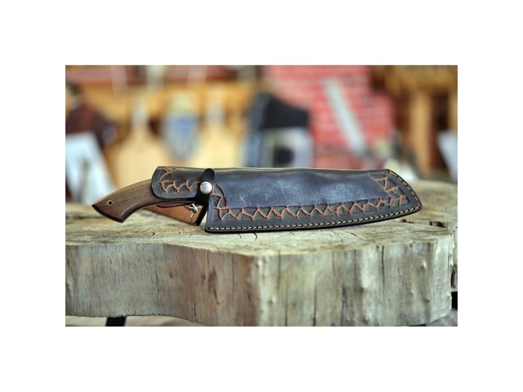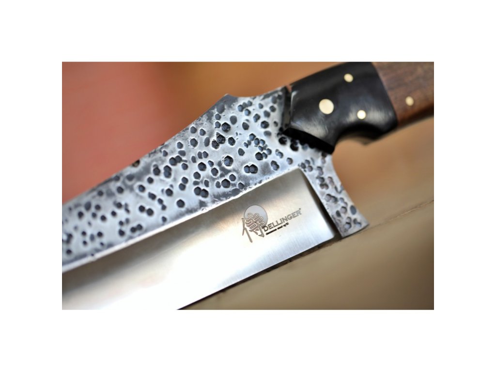 Exkluzivní mačeta Dellinger Executive D2 Walnut s masivní čepelí z oceli D2. Rukojeť z ořechového dřeva a buvolího rohu podtrhuje luxusní vzhled. Ručně kovaný nástroj ideální pro outdoor, zahradu i stylové BBQ. Dodávána s koženým pouzdrem.