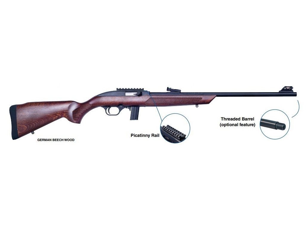 Nová varianta oblíbené samonabíjecí malorážky Rossi s dřevěnou pažbou, závitem na hlavni 1/2"-28, stavitelnými mířidly a základnou montáže pro puškohled
