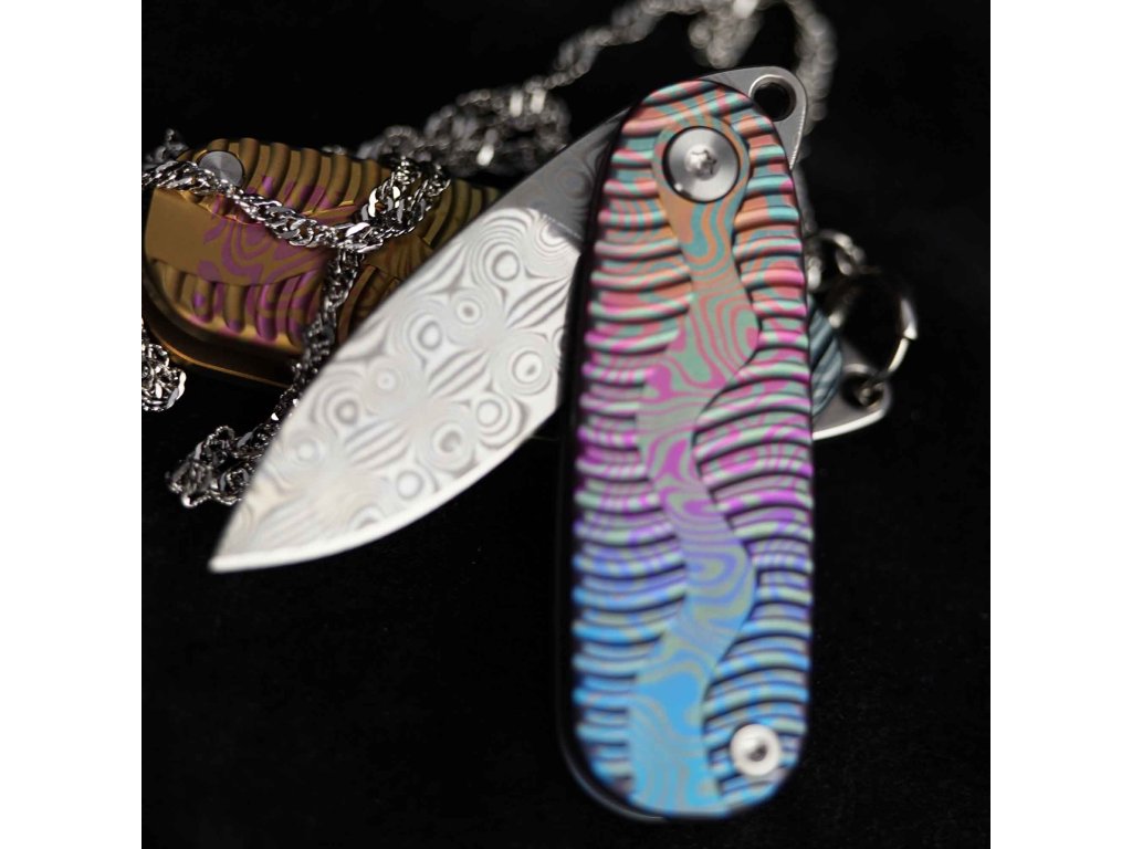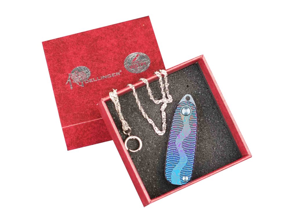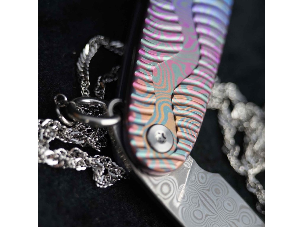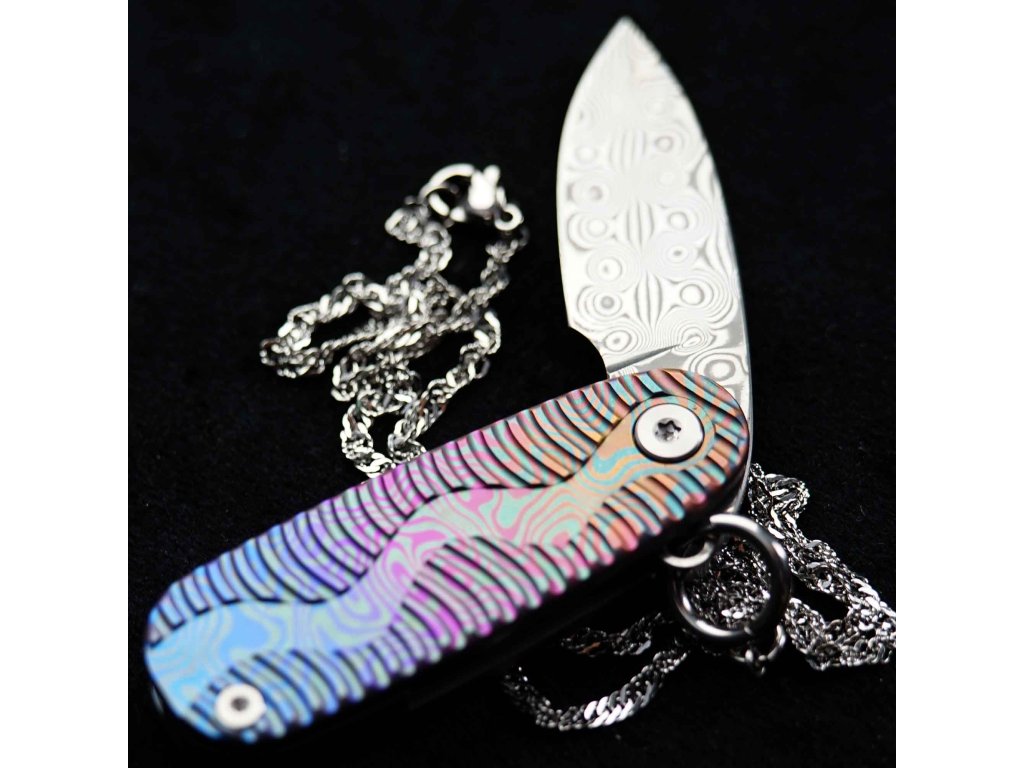 Malý, elegantní nůž na krk Dellinger Koishi Damascus VG-10 s damaškovou čepelí z oceli VG-10 a duhovou titanovou rukojetí z 6AL4V. Stylový doplněk i spolehlivý pomocník na cesty, do přírody i pro každodenní použití. Dodávaný s řetízkem a dárkovou krabičkou.