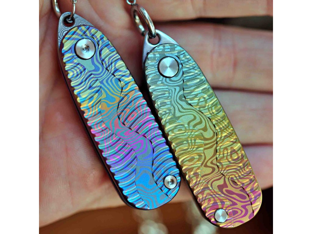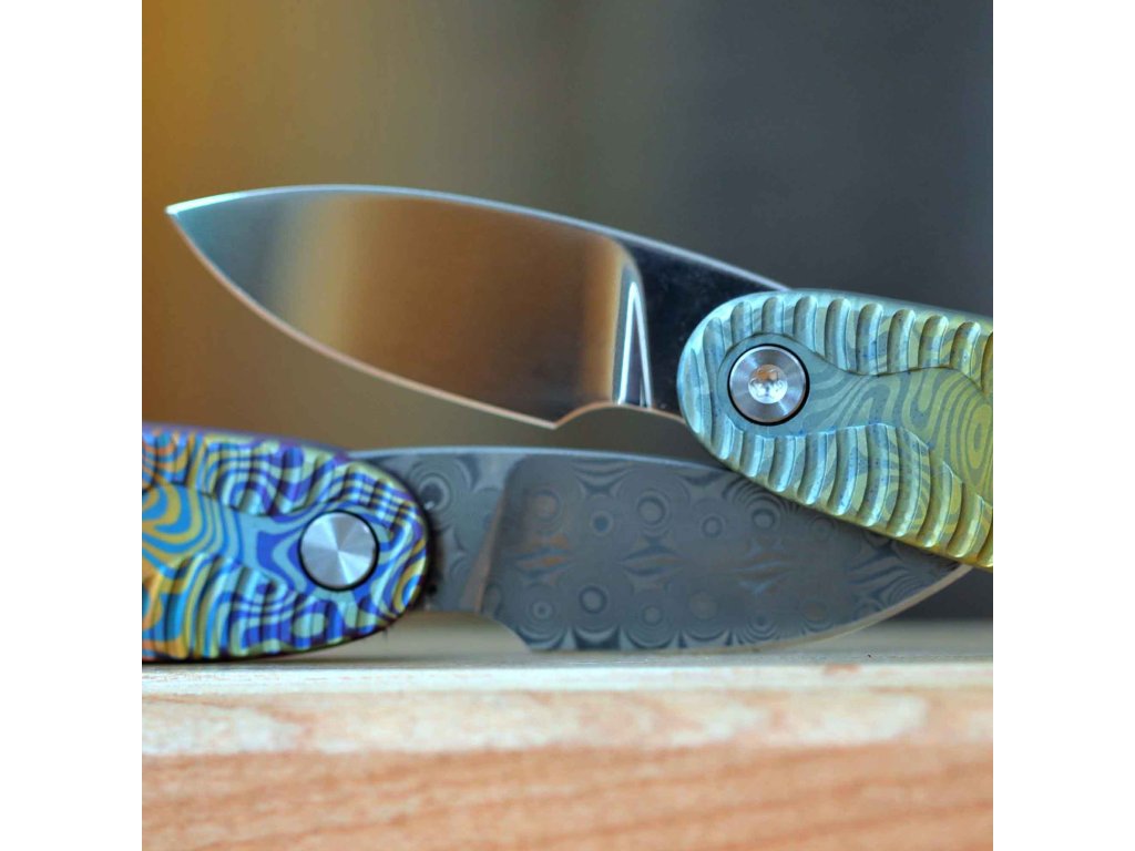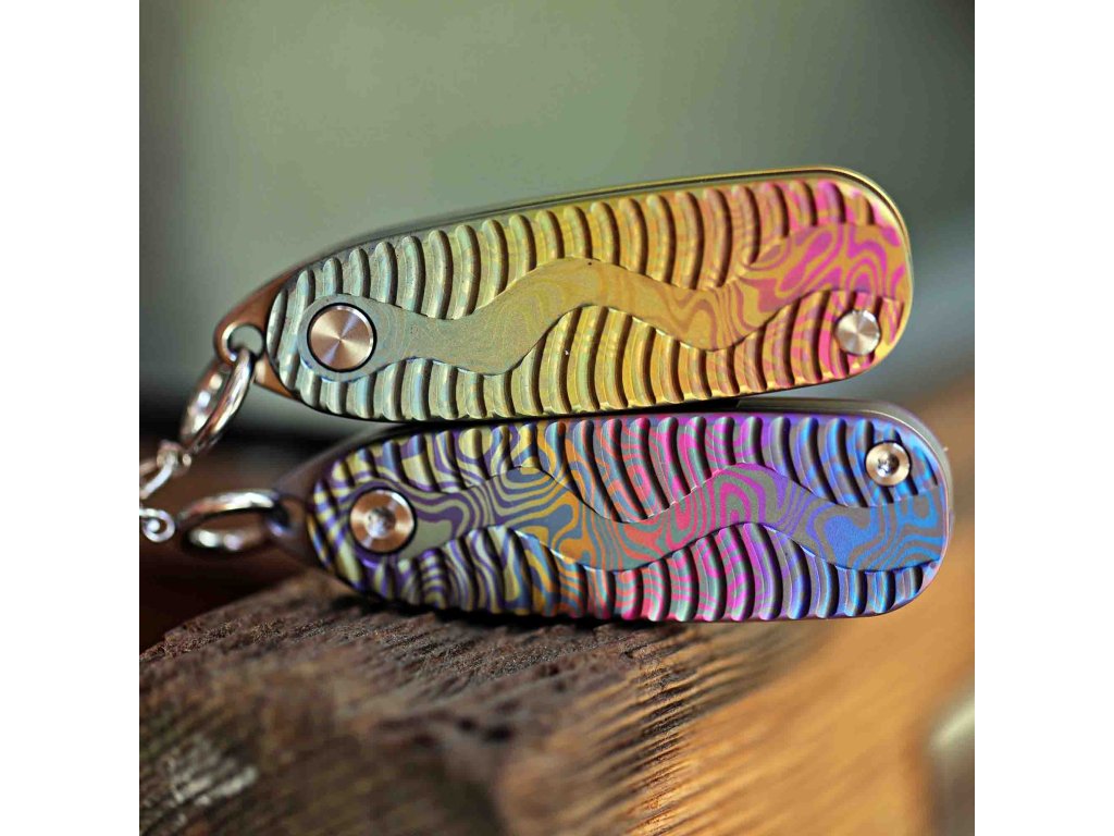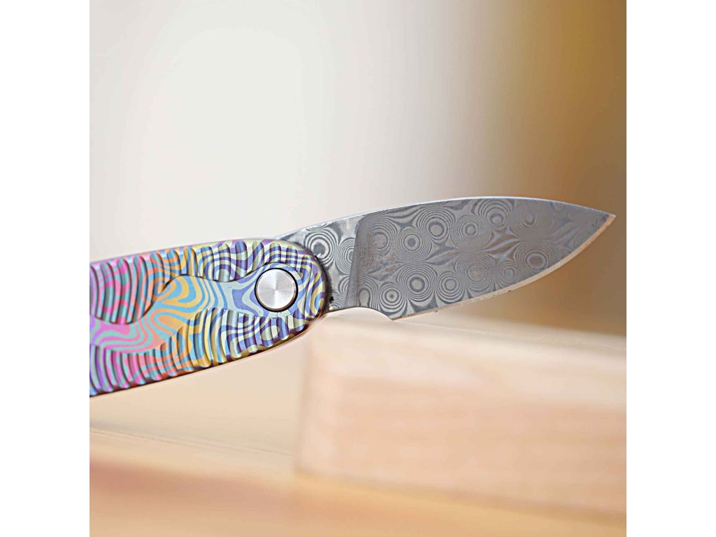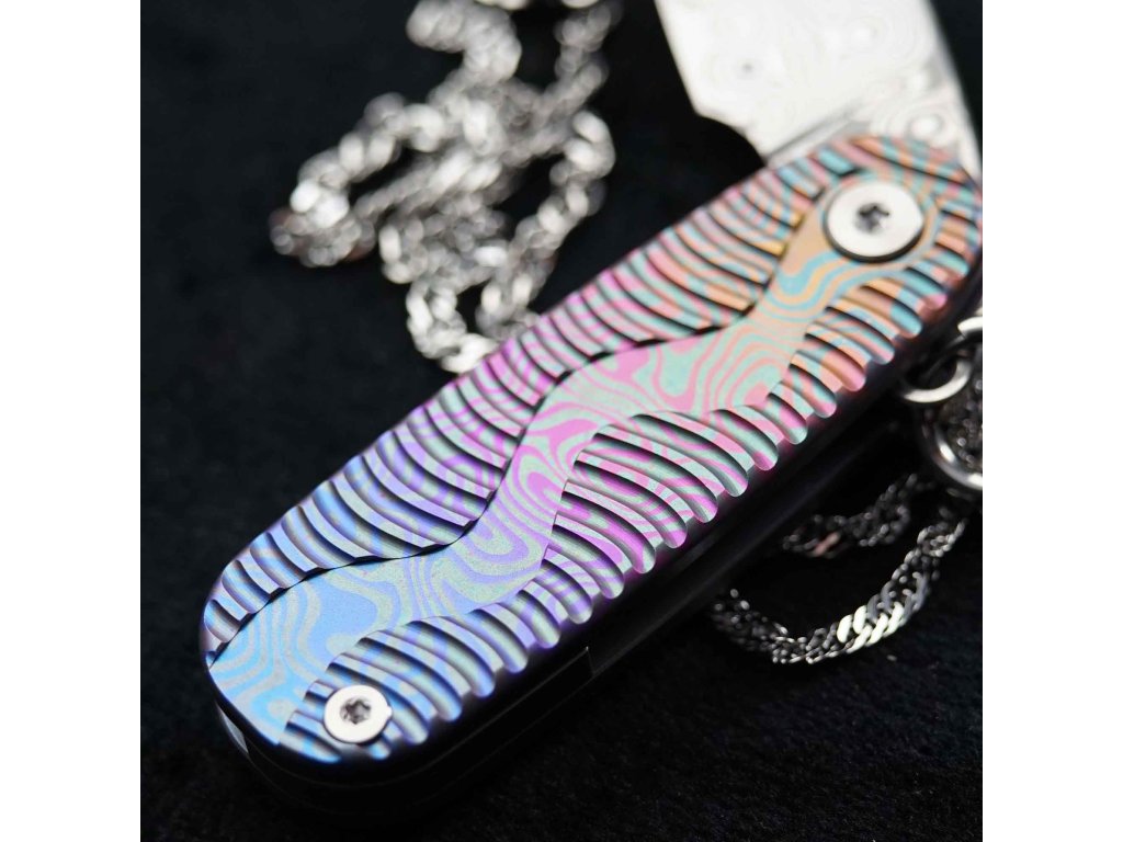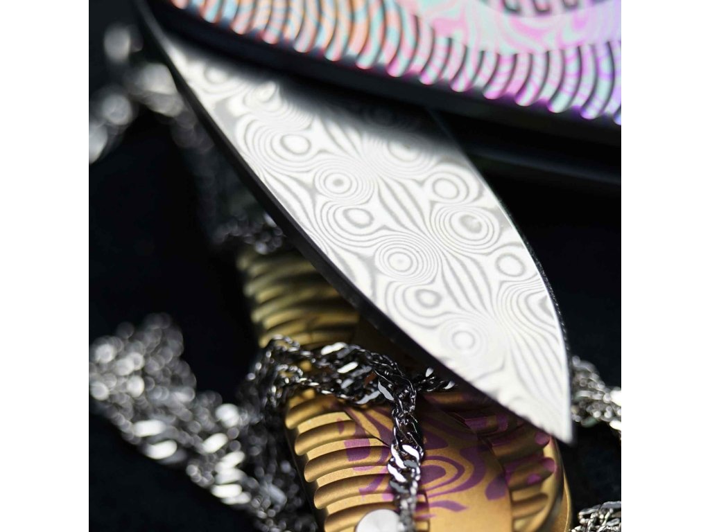 Rukojeť je vyrobena z titanu 6AL4V a září duhovými barvami, což noži dodává luxusní a originální vzhled.
