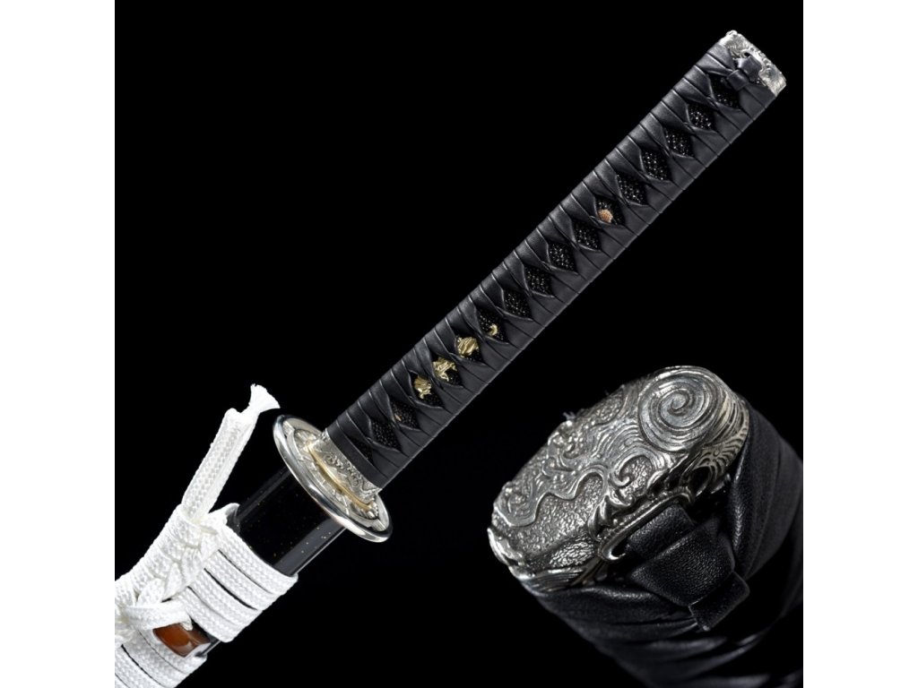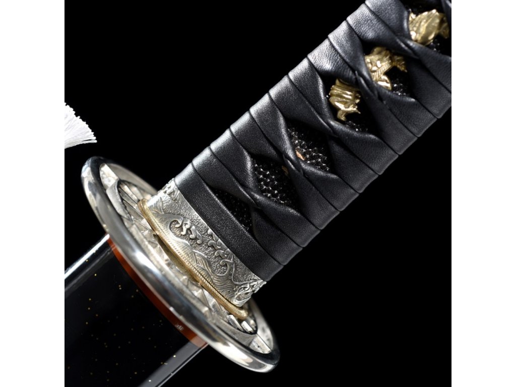 • Tsuka (rukojeť) - dřevěné jádro, potažena pravou rejnočí kůží (Samegawa), s černou koženou omotávkou ITO. Čepel zajištěna 2 bambusovými kolíky "mekugi". Z každé strany tsuky je menuki (ornament).