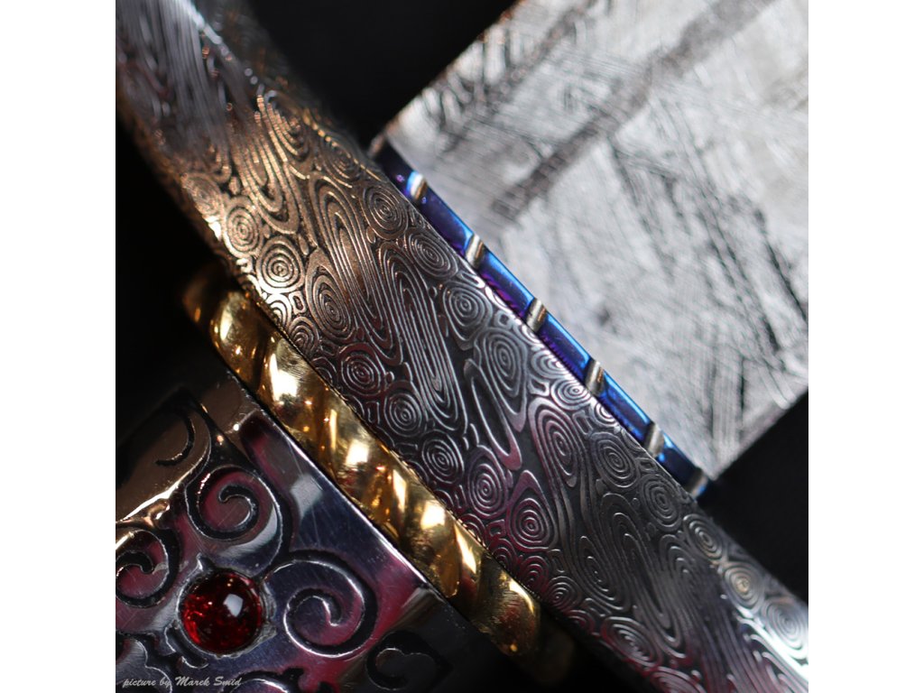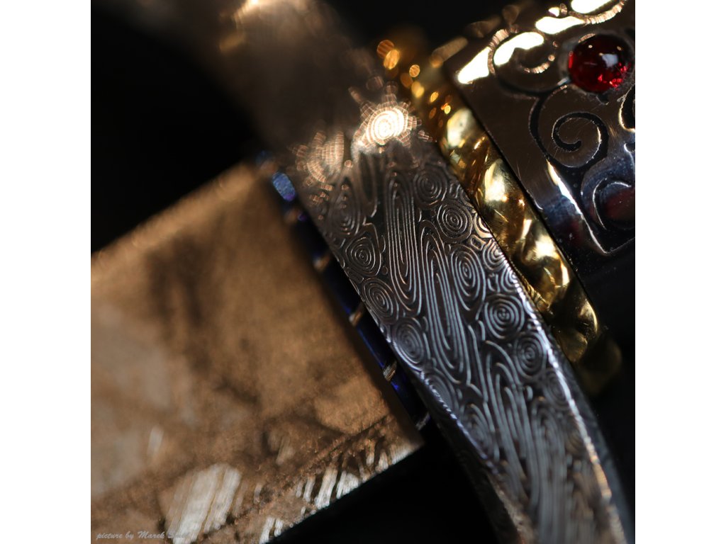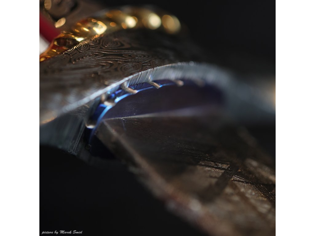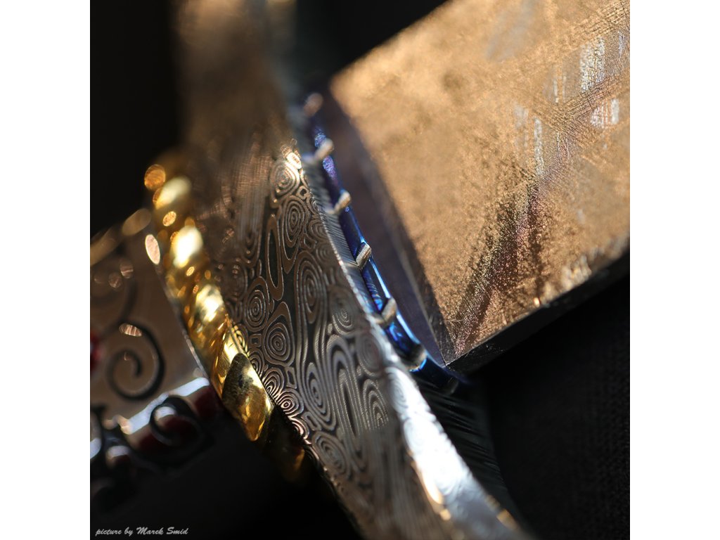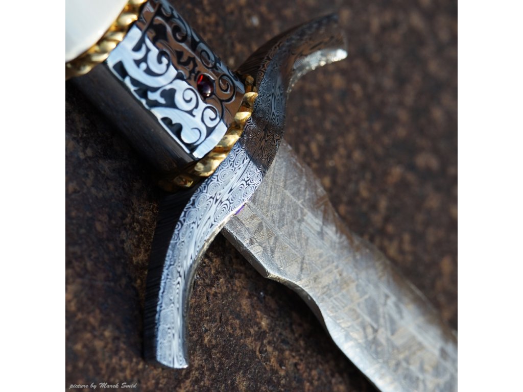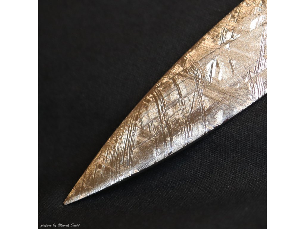 Tato obřadní dýka Muonionalusta TUTS Vás naplní historií každým svým mimořádným a jedinečně propracovaným detailem. Obřadní dýka s podobným tvarem čepeli z kovového meteoritu, byla nalezena v hrobu egyptského faraona Tutanchamona. Překrásná kresba meteoritu Widmanstätten je podtržena rukojetí z fosílie mamutího klu a doplňky z nerezové damascénské oceli.