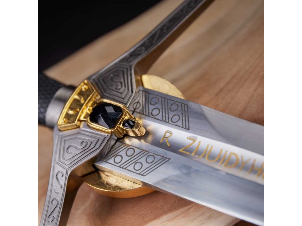 Masivní ocelová záštita s propracovaným reliéfem a válcovitá hlavice dodávají meči autentický vzhled známý z fantasy série. Pogumovaná rukojeť zajišťuje pevný a pohodlný úchop při manipulaci. Meč je dodáván v dřevěném pouzdru potaženém černou koženkou s kovovým zdobením a praktickým popruhem na přenášení.