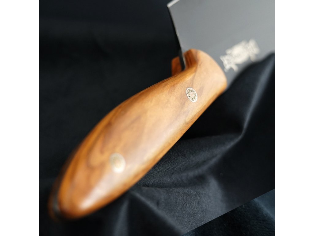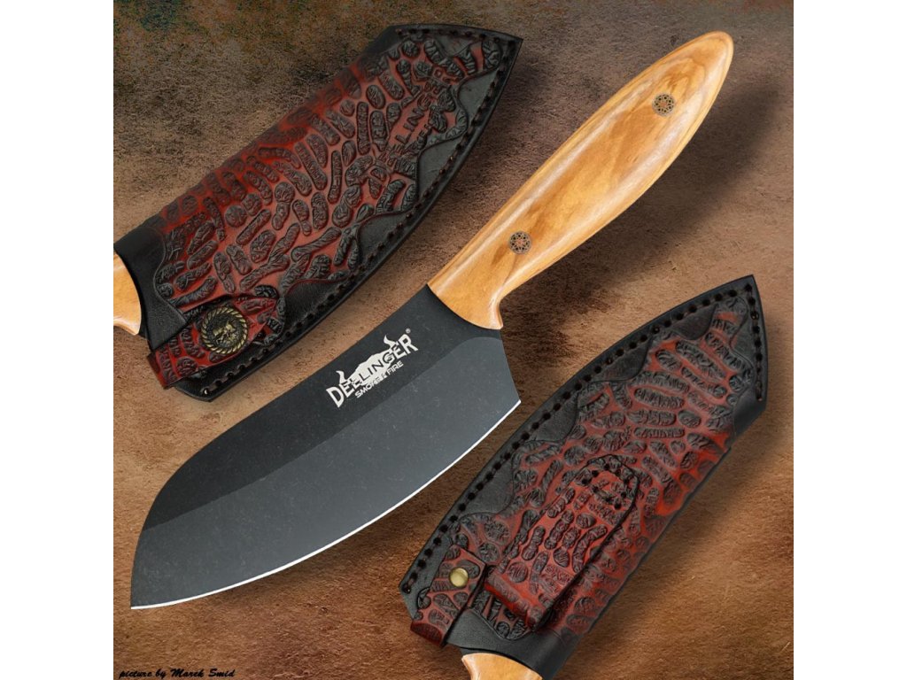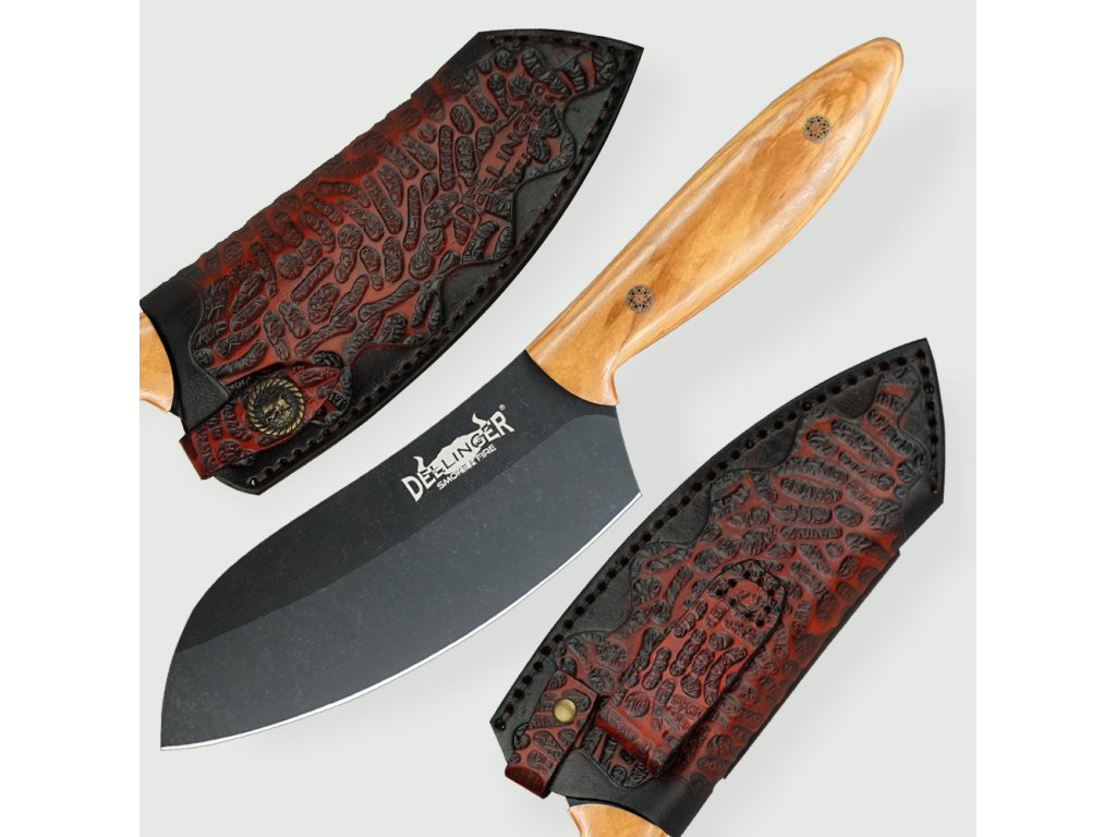 Exkluzivní kuchyňský nůž s rukojetí z překrásného olivového dřeva. Tento kuchyňský nůž vhodný pro BBQ je kovaný a zpracovaný z oceli D2. Po přesném a pečlivém vytvrzení, temperování a žíhání dosahuje tvrdosti Rockwell 60-62 (HRC). Jeho ostří jen tak někdo, nebo něco nepoškodí. Pro krájení a sekání zeleniny, masa a kostí je to klíčový nástroj bez kterého se už nikdy neobejdete. Budete chtít ukázat každé návštěvě jaký kus překrásného železa se skrývá ve Vaší kuchyni.