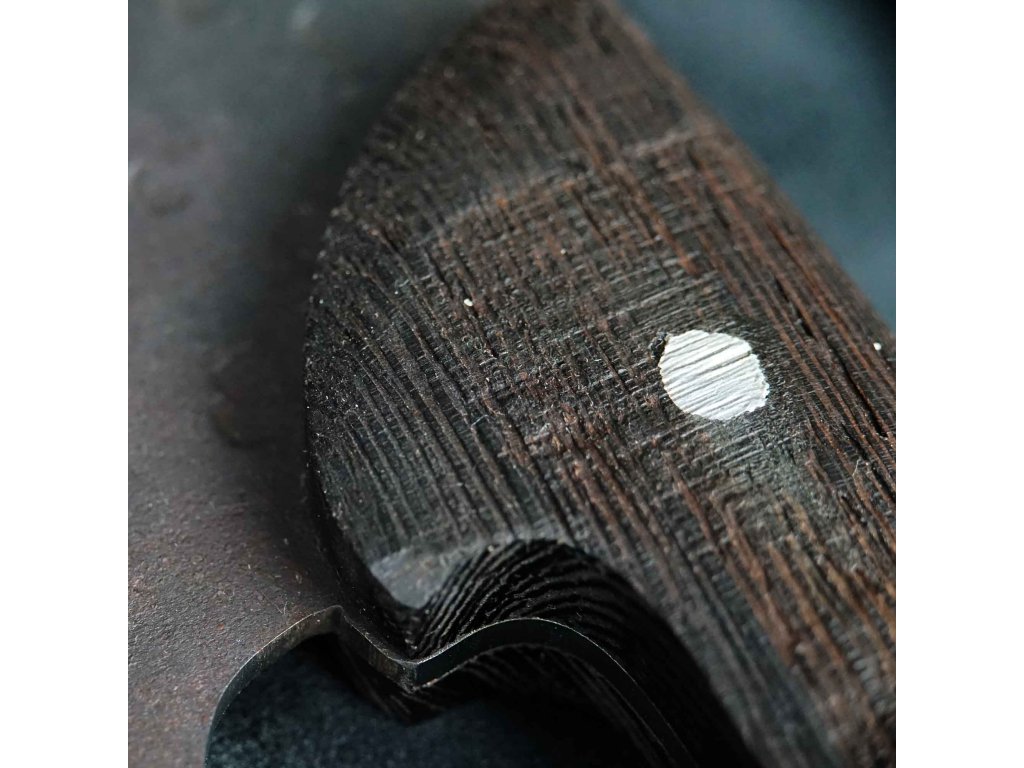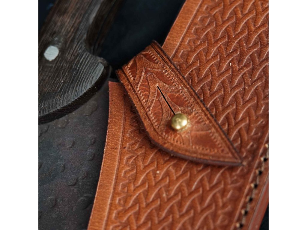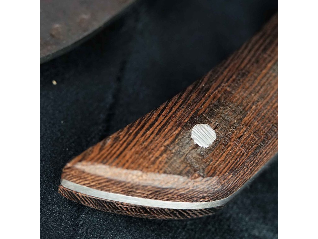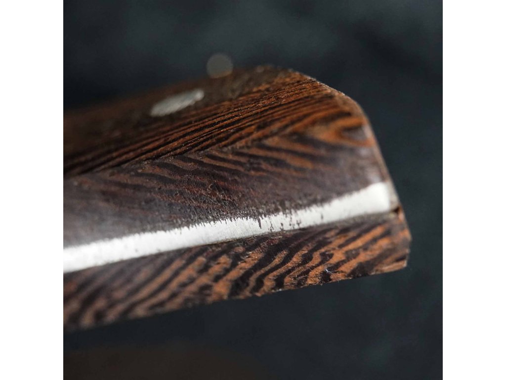 Rukojeť je z kvalitního kartáčovaného dřeva Wenge, které je tmavé, pevné a má jemnou strukturu. Je ergonomicky tvarovaná pro pohodlný úchop a zajištěna třemi nýty, což zvyšuje její odolnost a pevnost. Tento nůž je dodáván s koženým pouzdrem, které chrání čepel a usnadňuje nošení. Celkově jde o nůž vhodný nejen pro profesionální kuchaře, řezníky, ale i pro nadšence do vaření, nebo grilování. Své si najdou i sběratele nožů, kteří ocení jak funkčnost, tak jedinečný design.