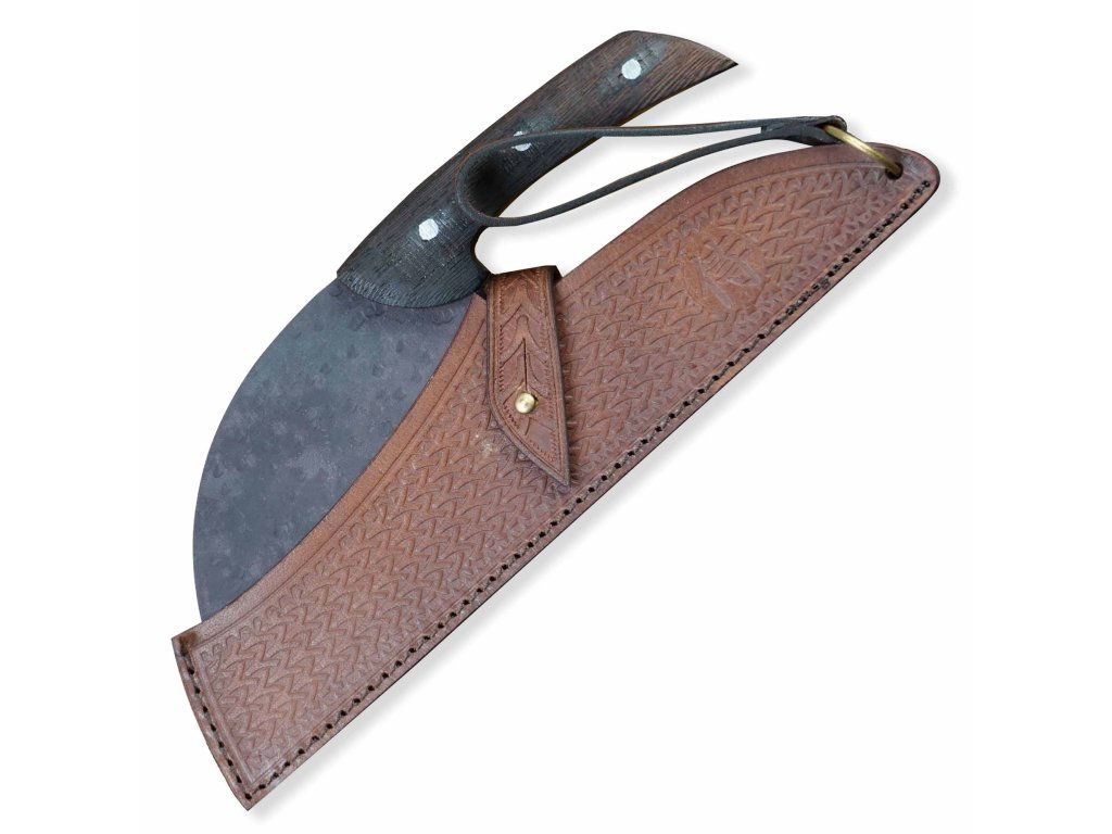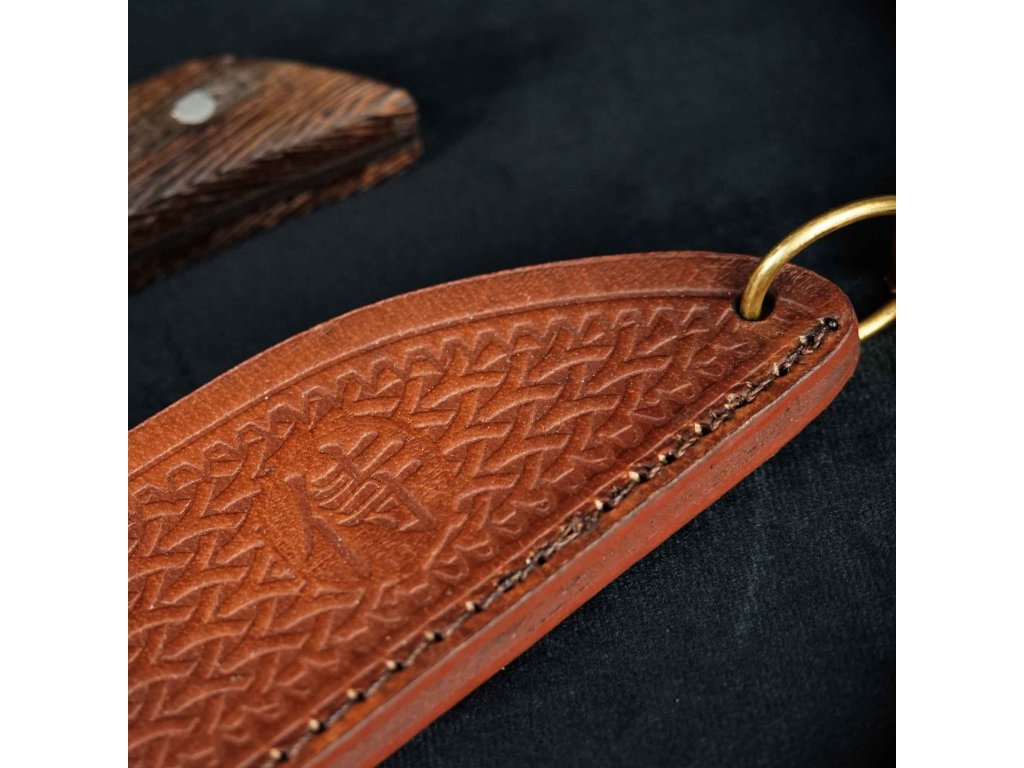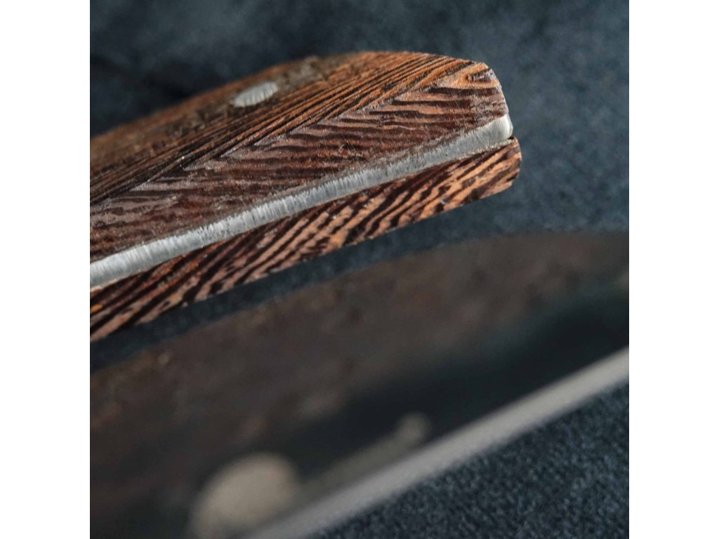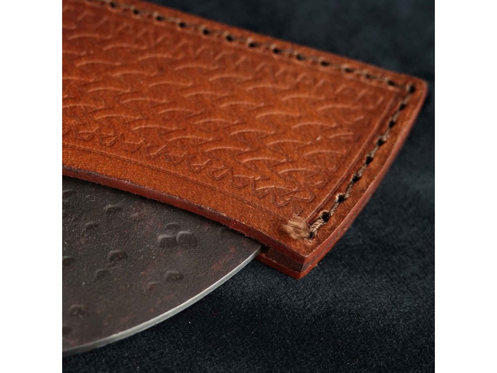 Rukojeť je z kvalitního kartáčovaného dřeva Wenge, které je tmavé, pevné a má jemnou strukturu. Je ergonomicky tvarovaná pro pohodlný úchop a zajištěna třemi nýty, což zvyšuje její odolnost a pevnost. Tento nůž je dodáván s koženým pouzdrem, které chrání čepel a usnadňuje nošení. Celkově jde o nůž vhodný nejen pro profesionální kuchaře, řezníky, ale i pro nadšence do vaření, nebo grilování. Své si najdou i sběratele nožů, kteří ocení jak funkčnost, tak jedinečný design.