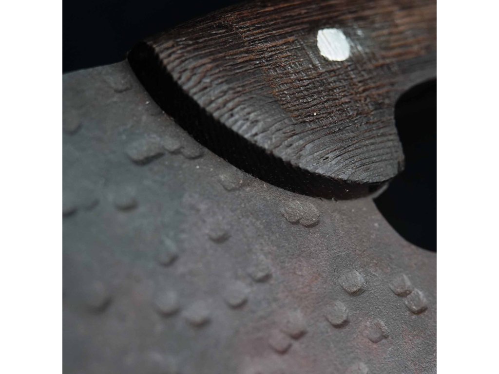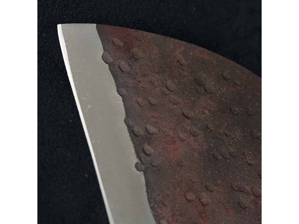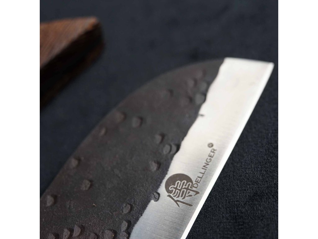 Řeznický nůž Dellinger Eisen D2 Wenge, navržený s důrazem na tradiční řemeslné zpracování a kvalitní materiály. Čepel je vyrobena z oceli typu D2, která je známá svou tvrdostí, odolností vůči opotřebení a dlouhotrvající ostrostí. Povrch čepele má texturu s kovaným vzhledem, což dodává noži rustikální, autentický vzhled, ideální pro ty, kteří preferují robustní a esteticky jedinečné nástroje. Nůž má celkově hrubé a nekompromisní opracování, které působí používaným VINTAGE stylem.