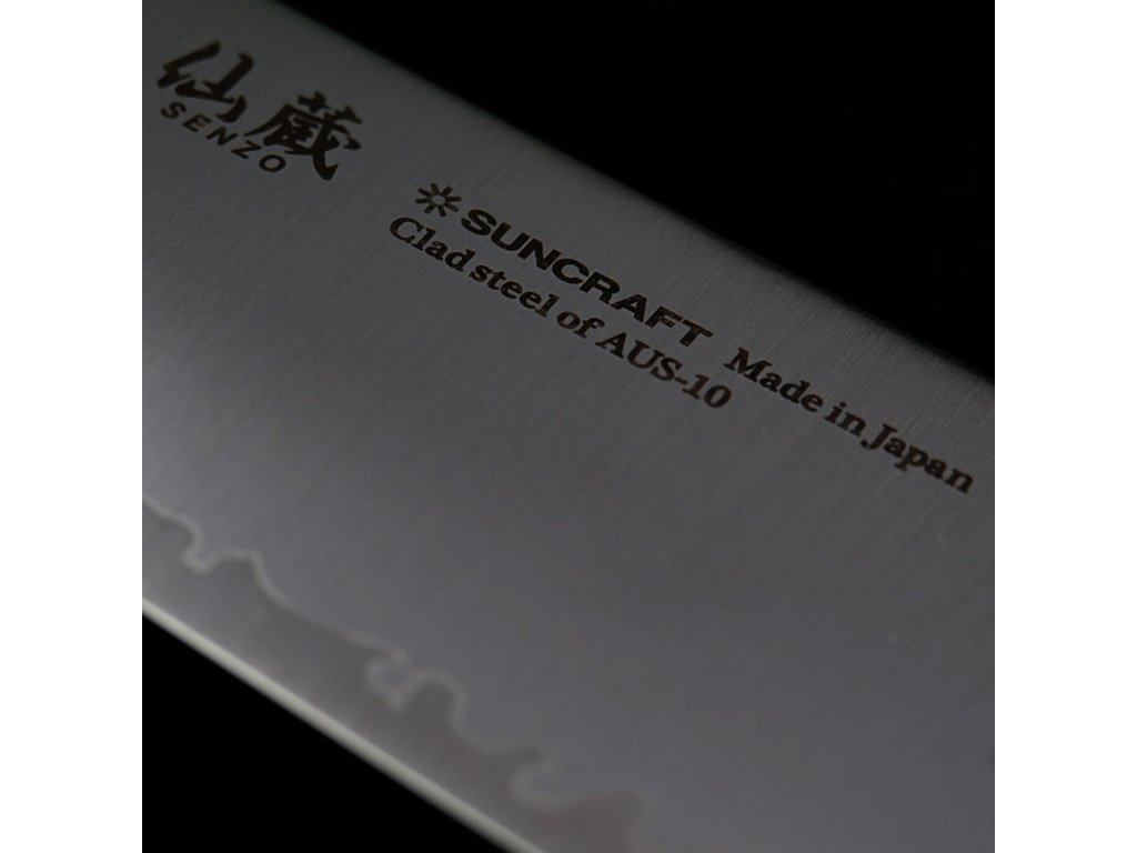 Nože Suncraft Senzo Clad jsou vyrobeny z 3 plátové oceli AUS-10 o tvrdosti (58 +/- 1 HRC). Ocel AUS-10 má stejný obsah uhlíku jako ocel 440C, ale méně chromu, takže je více houževnatá a korozně méně odolná než 440C. Přidáním vanadu se u všech zvýšila odolnost proti opotřebení.