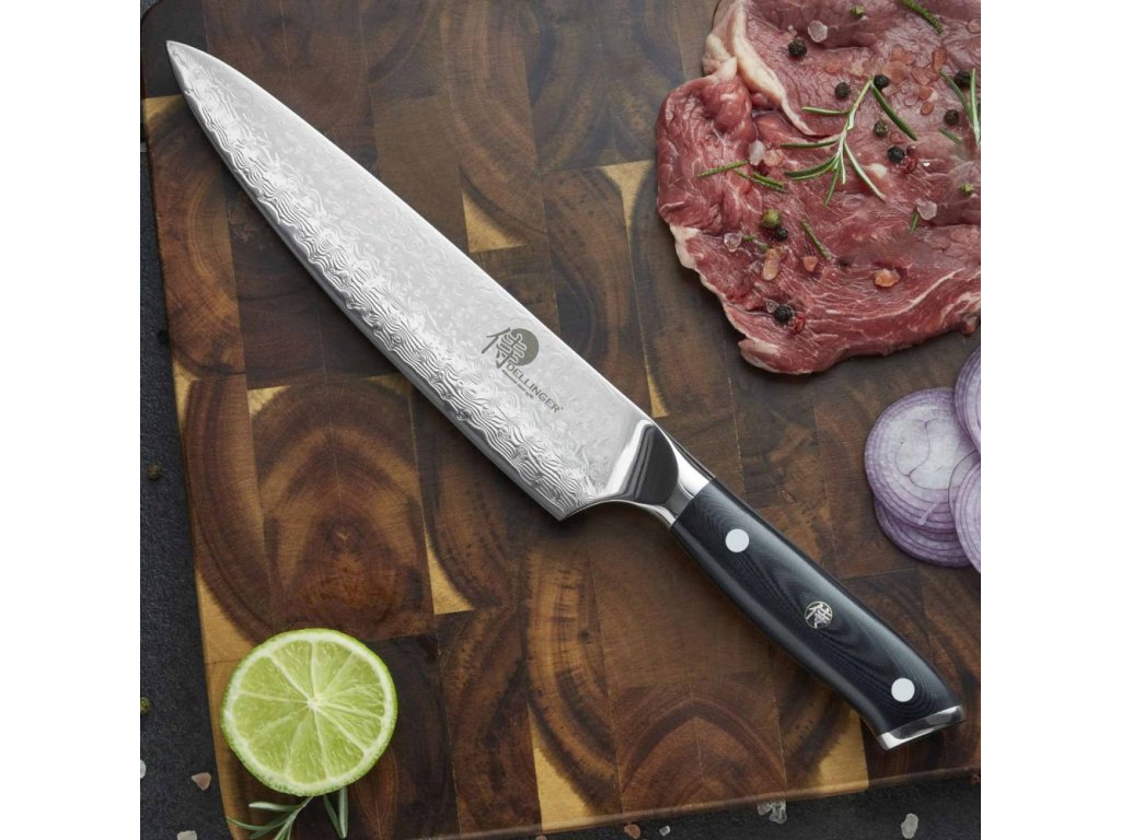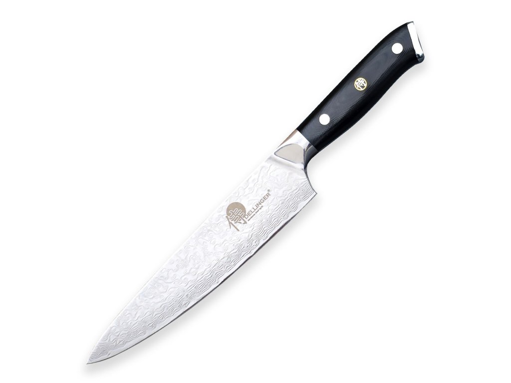 Nůž šéfkuchaře Chef/Gyuto ze série Dellinger Samurai z damaškové oceli VG-10, skvělý nůž pro krájení, plátkování, čištění, kolébkové krájení masa, ovoce, zeleniny a bylinek. Ergonomická rukojeť z G-10 s ozdobným nýtem zajišťuje pohodlný úchop. Délka ostří 200 mm.