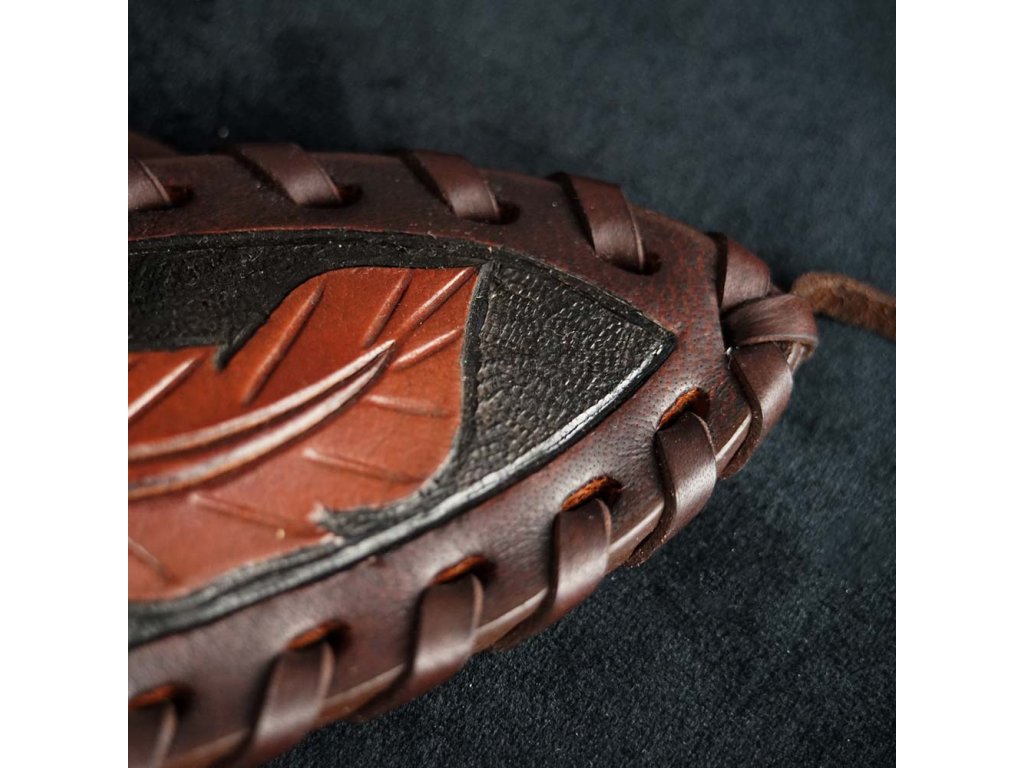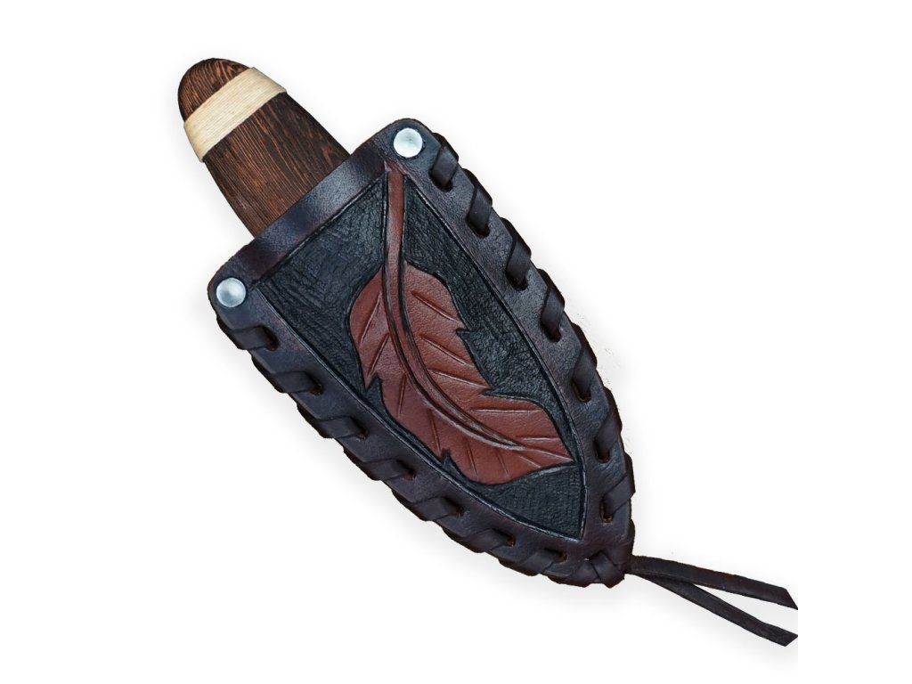 - Pouzdro: Precizně zpracované kožené pouzdro s reliéfním motivem ptačího pera, ručně šité a zpevněné kovovými nýty.
