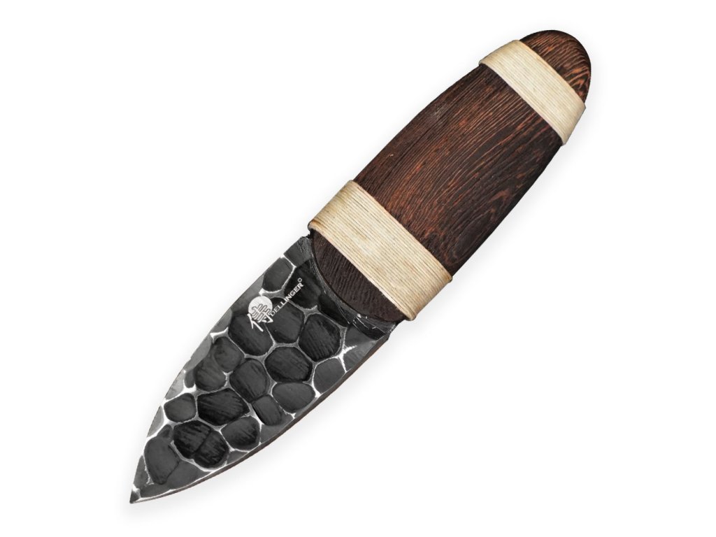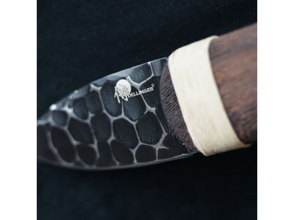 Nůž Dellinger D2 Ötzi - Black Obsidián, inspirovaný historickými noži pravěkého člověka Ötziho. Design nože kombinuje tradiční prvky s moderním zpracováním, čímž vytváří jedinečný sběratelský i funkční kousek. Čepel z oceli D2 - hamerovaný (kovaný) efekt, s rustikálním a tradičním vzhledem.