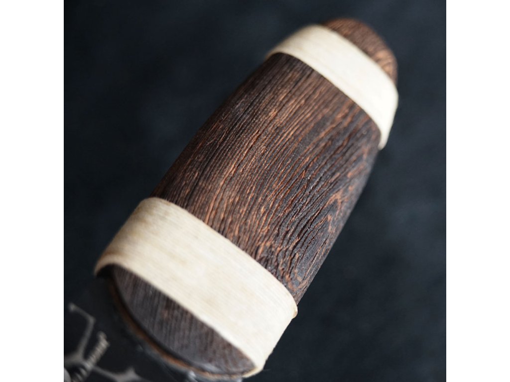 - Rukojeť: Kombinace exotického dřeva wenge s přírodním opletem, což zajišťuje pevný úchop a rustikální vzhled.