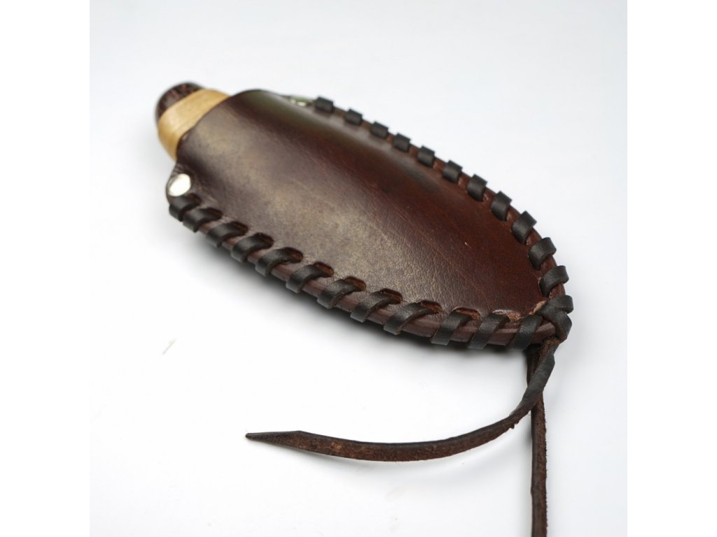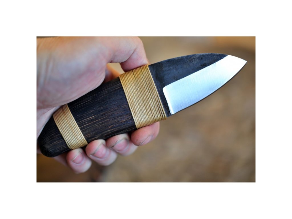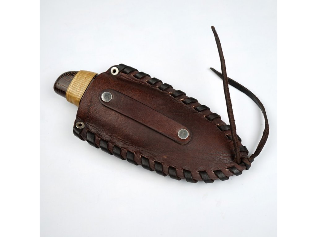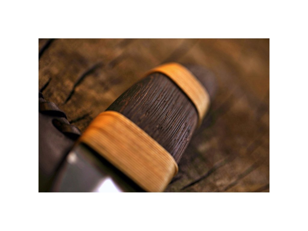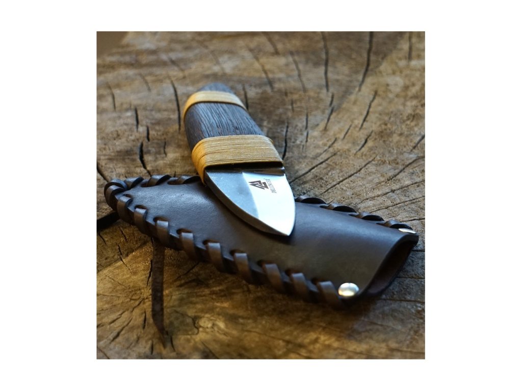 Nůž disponuje ergonomickou rukojetí z tmavého dřeva Wenge s autentickým omotem z konopného provazu. Tento praktický a netradiční outdoorový nůž poskytuje spolehlivý výkon při práci se dřevem i běžných úkonech v tábořišti. Nůž je dodávaný v koženém pouzdru z kvalitní hovězí kůže, které podtrhuje jeho přírodní charakter.