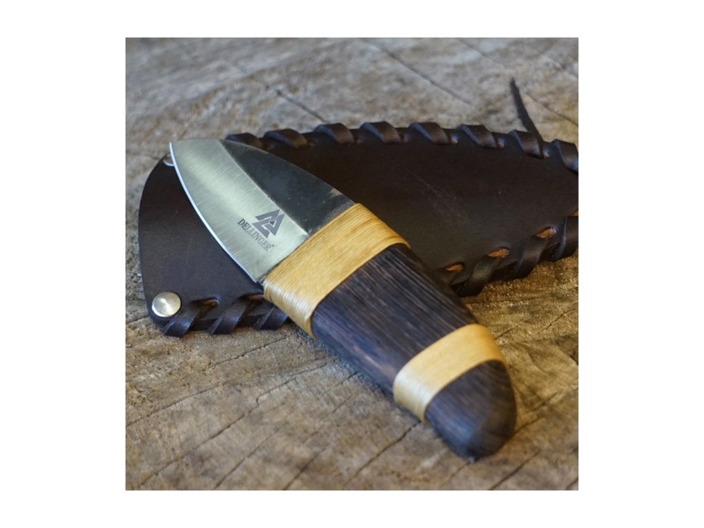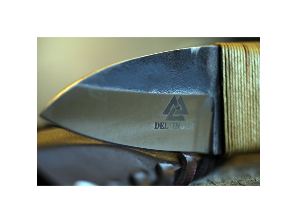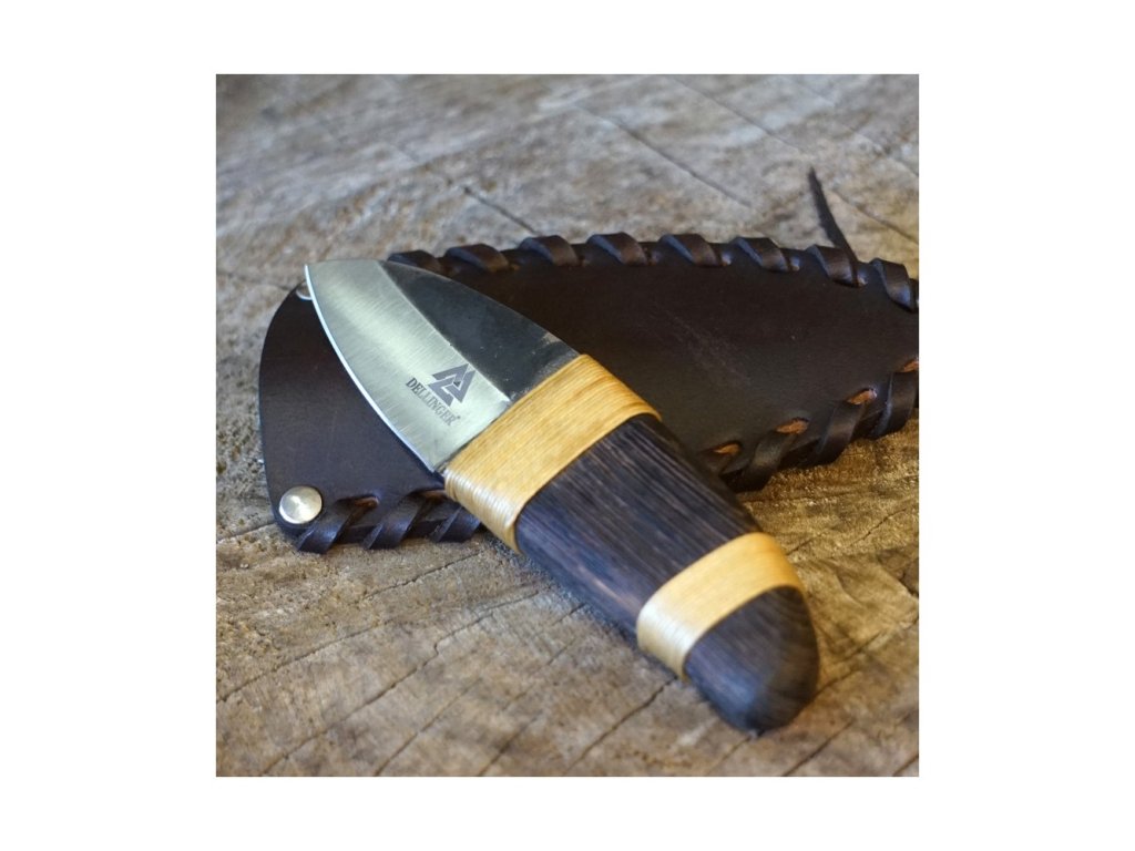 Pevný nůž Dellinger Ötzi inspirovaný pravěkým pazourkem. Čepel z houževnaté nástrojové oceli D2, rukojeť z exotického dřeva Wenge s konopným omotem. Ideální společník pro outdoor a bushcraft. Dodávaný s koženým pouzdrem z hovězí kůže.