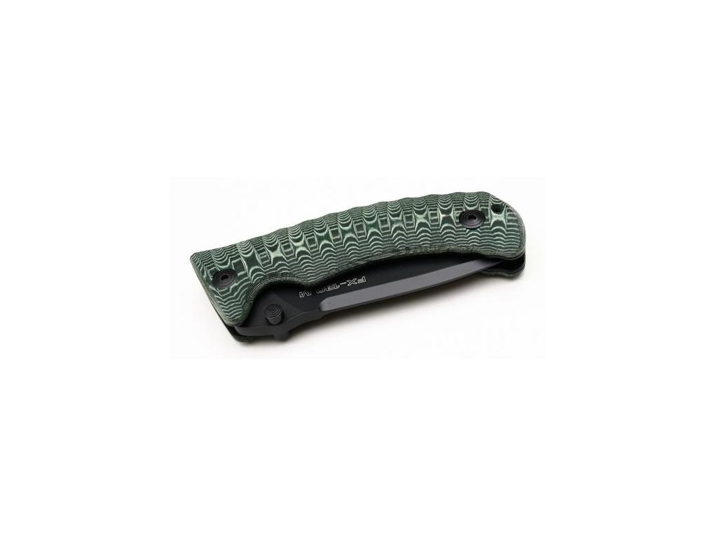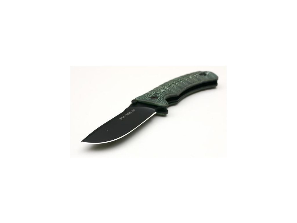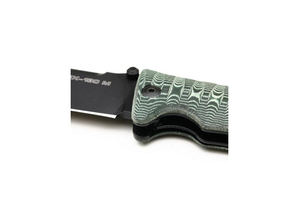 Zavírací mohutný nůž, určený jeména pro myslivost nebo trampy. Široká, teflonovaná čepel, vyrobená z oceli N690Co je 5mm silná, 9.5cm dlouhá a je osazená oboustranným kolíčkem pro snažší otevření jednou rukou. Ergonomicky tvarovaná střenka z mikarty s designově zajímavým výbrusem s otvorem pro lanko. Nůž je vybaven dvěma pojistkami proti zavření, což při jeho mohutnosti dává pocit nože s pevnou čepelí. Kožené pouzdro, hmotnost nože 200g