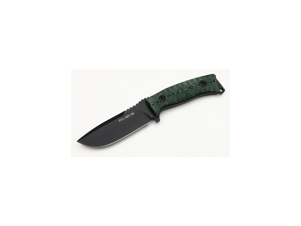 Nůž s pevnou čepelí, určený jeména pro myslivost nebo trampy. Široká, teflonovaná čepel, vyrobená z oceli N690Co je 5mm silná, 9.5cm dlouhá. Ergonomicky tvarovaná střenka z mikarty s designově zajímavým výbrusem s otvorem pro lanko. Kožené pouzdro, hmotnost nože 200g.