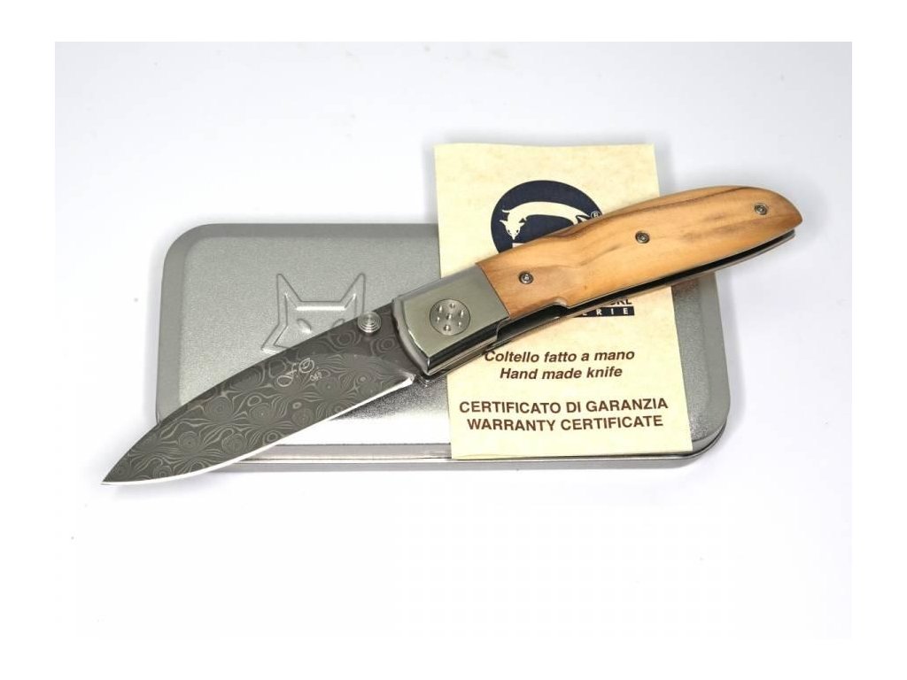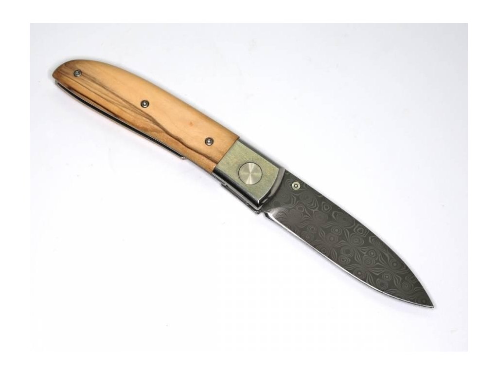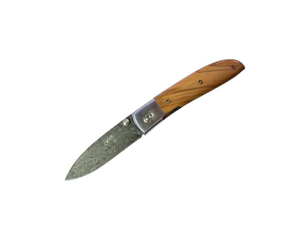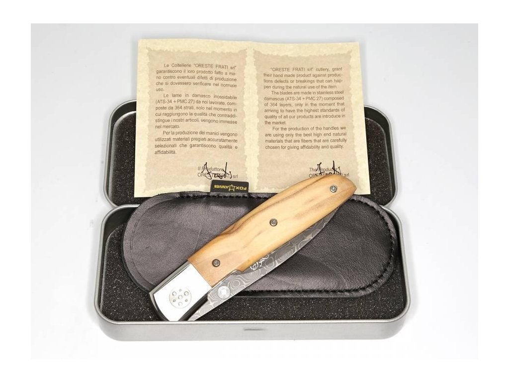 Kapesní zavírací nůž v dárkové plechové krabičce. Čepel nože z damaškové oceli Typhoon, střenka nože z olivového dřeva. Spodní pojistka a kolíček pro snažší otevírání jednou rukou (”one hand”). Hmotnost 95 g, délka čepele 7cm, tloušťka čepele 3 mm, délka celková 18.5 cm. Nůž se dodává v plechové dárkové kazetě s kapesním pouzdérkem.