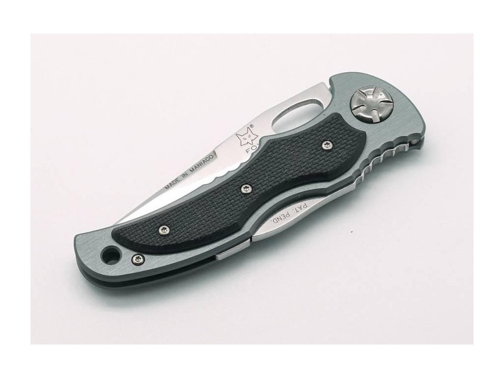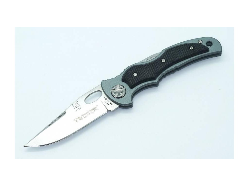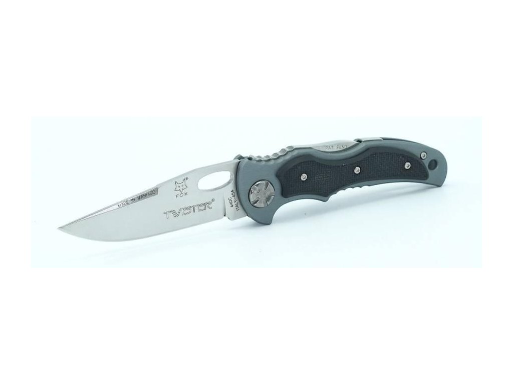 Zavírací nůž FOX 454 Twister v šedočerné barvě. Čepel z nožířské oceli 440C je opatřena otvorem pro snažší otevření jednou rukou, střenky jsou z šedě, saténově eloxovaného duralu T6 6061, doplněné o protiskluzové plátky černého materiálu G10. Očko pro připevnění lanka.