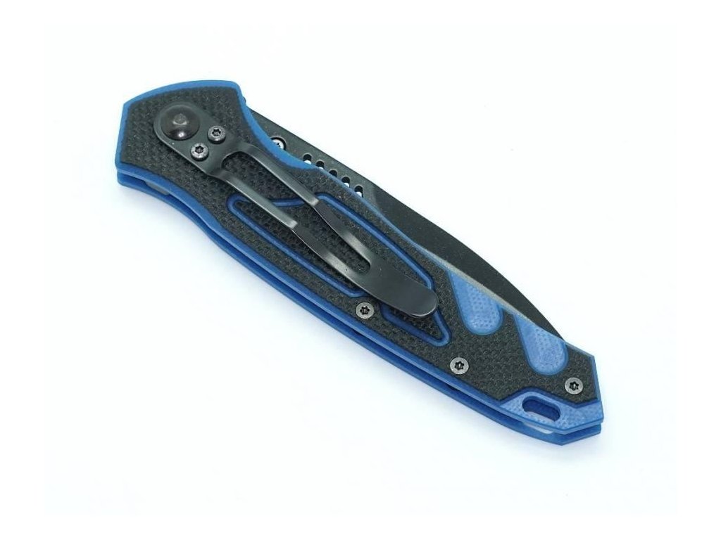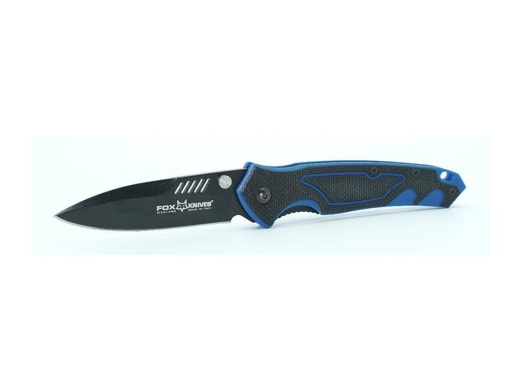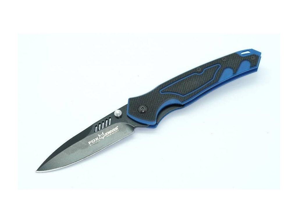 Zavírací nůž FOX HARRIER s modro-černou střenkou z materiálu G10. Čepel z nožířské oceli N690Co, "One hand” systém s kolíčkem v čepeli. Spona na opasek.