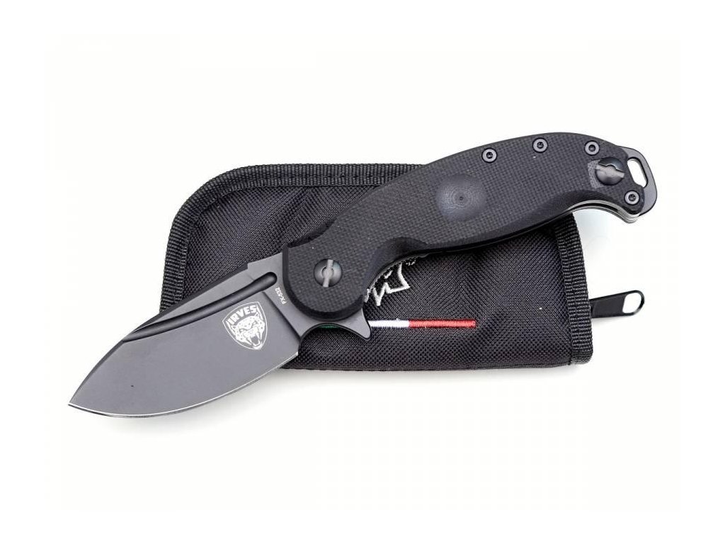 Mohutný zavírací nůž z designerské dílny Andrease Weitzela. Střenka z materiálu G10, čepel z nožířské oceli N690Co, spodní tlačná pojistka, ostruha na rychlé otevření jednou rukou. Hmotnost bezmála 1/4 kila, dárková etuje Fox.