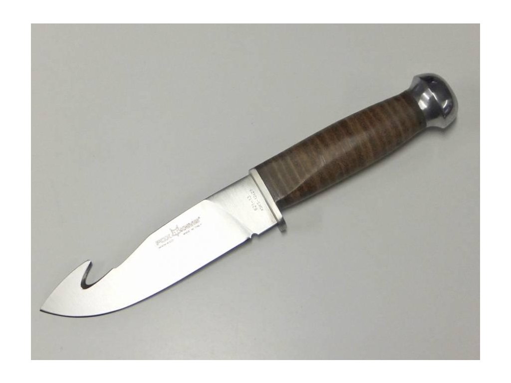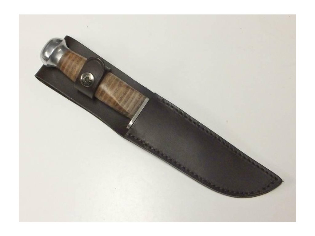 Lehký lovecký nůž s pevnou čepelí a se střenkou z koženého opletu. Párák na práci se zvěří, kožené pouzdro.