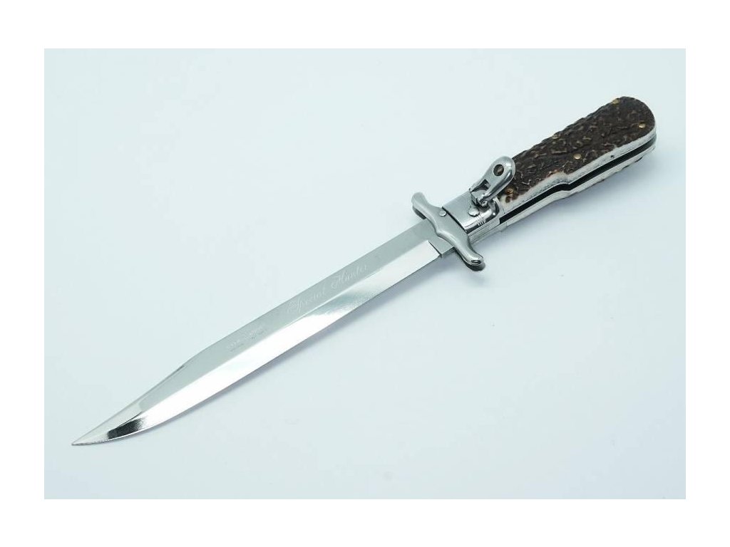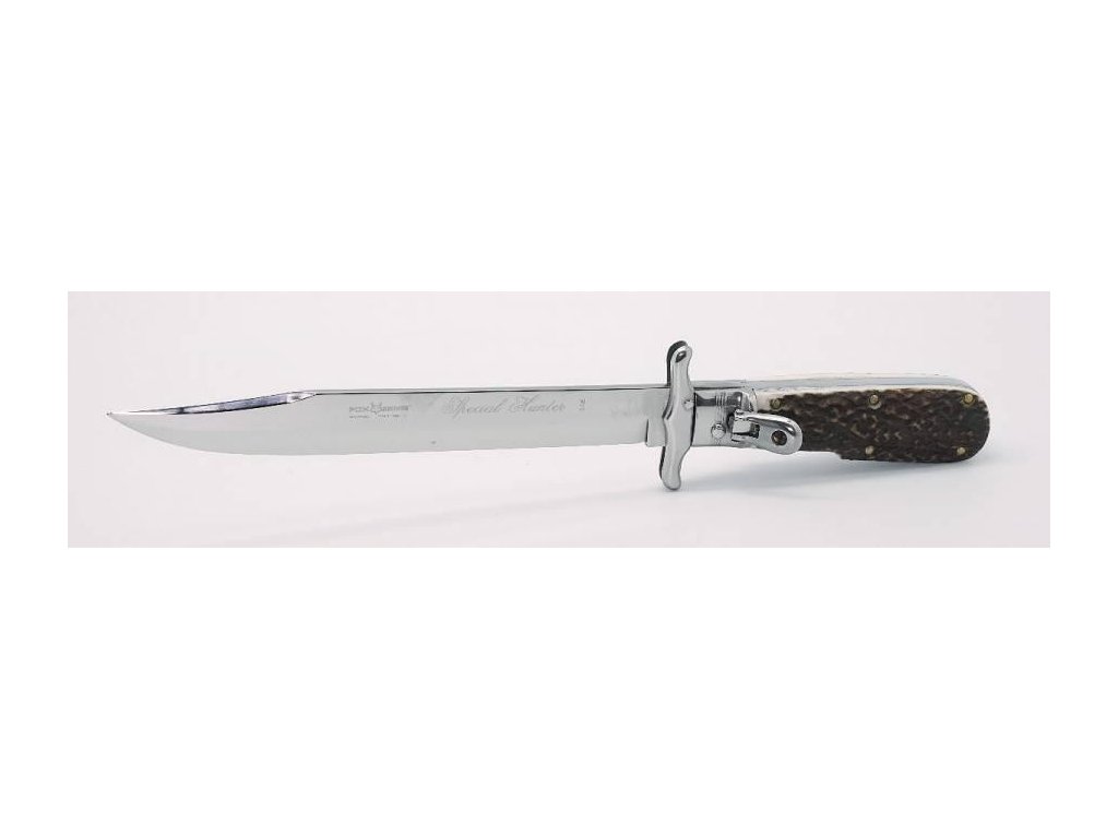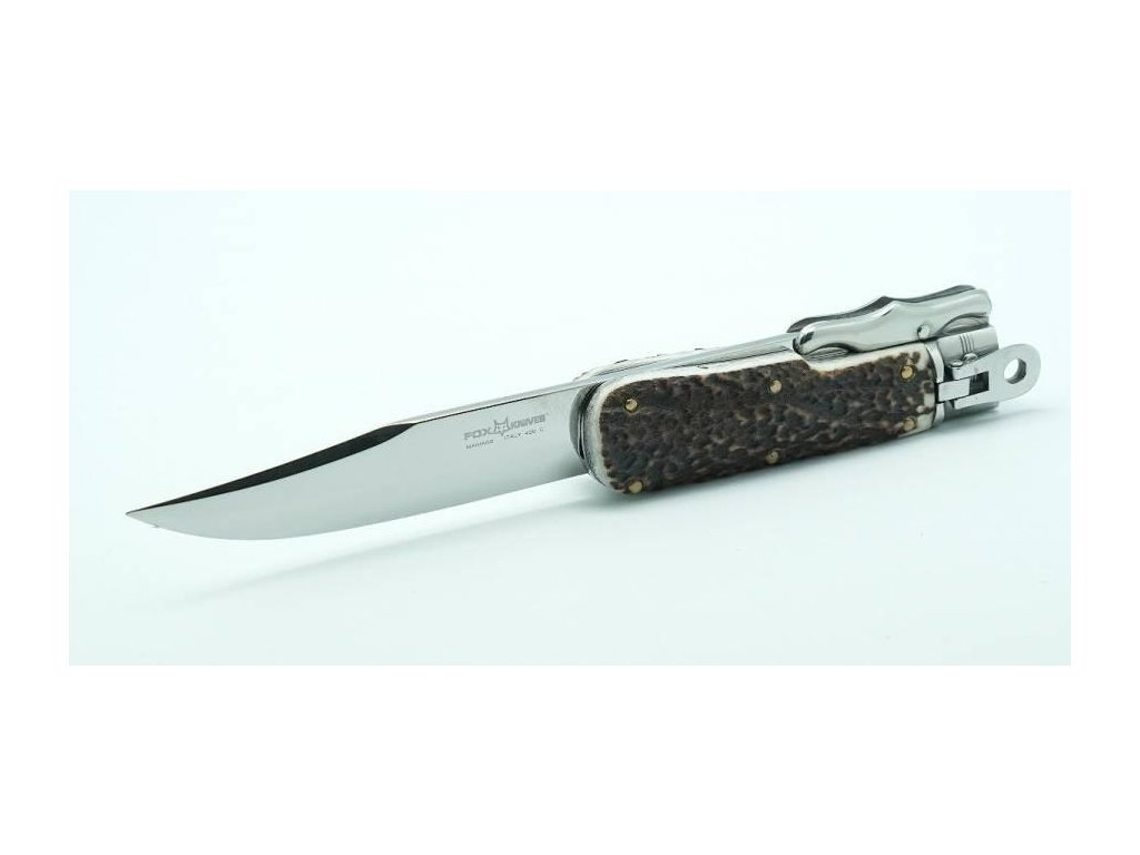 Prodlužovací lovecký nůž - letitá klasika od FOXe. Čepel z oceli 420C, střenka z pravého parohu. Čepel vyklápěcí přes pojistku. Opaskové kožené pouzdro.