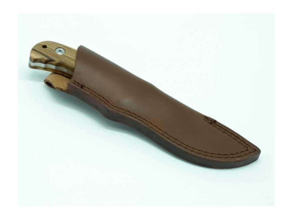 Pevný nůž se střenkou z exotického dřeva, pocházejícího ze střední Ameriky, označovaného zebrawood (Astronium graveolens). Čepel z nožířské oceli 440. Kožené opaskové pouzdro.