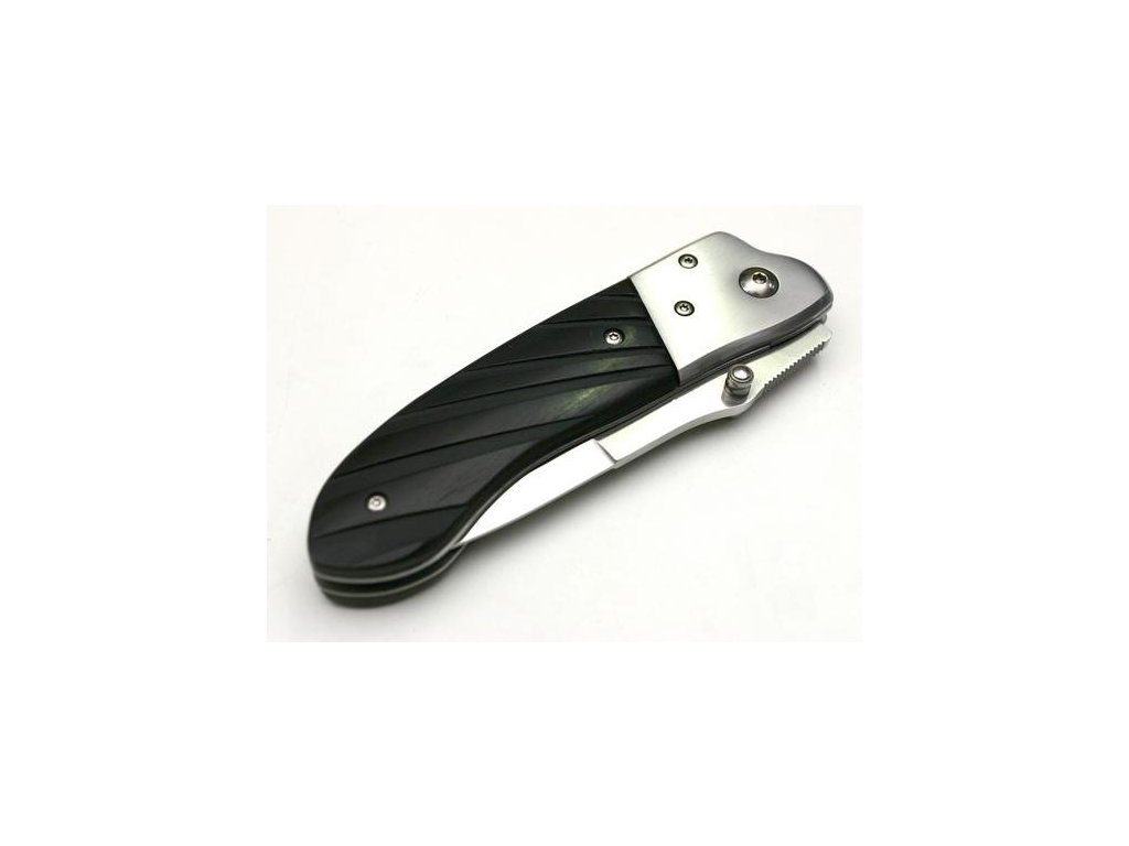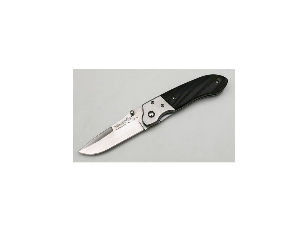 Zavírací nůž z řady BLACK FOX. Částečně bajonetová čepel 3mm silná, vyrobená z nerezové nožířské oceli 440 opatřená oboustranným kolíčkem pro snažší otevření jednou rukou. Střenka z masivního, tmavě mořeného dřeva, zdobená rýhováním. Kožené pouzdro na opasek. Délka čepele 8cm, celková délka 20cm, hmotnost 155 g.