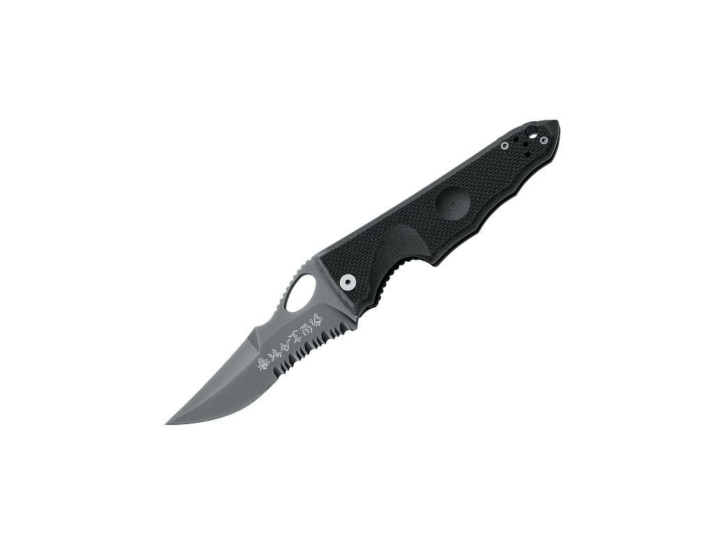 Zavírací nůž Military Design (by Borut Kincl) se střenkou protiskuzově upraveného materiálu G10, klisem na opasek a dvojitou pojistkou proti zavření. Čepel se 1/3 zoubkovaným ostřím z nořížské oceli N690Co, povrchově černěná. Čepel o délce 10cm, délka v otevřeném stavu 22cm, hmotnost 128g. Dodávám v nylonovém pouzdře.