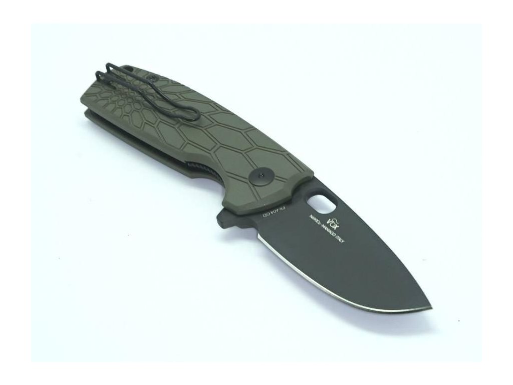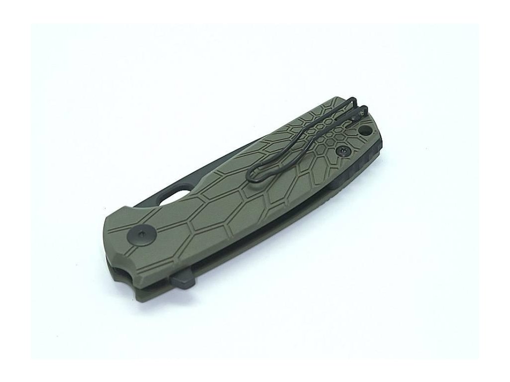 Kapesní zavírací nůž se širokou čepelí z oceli N690Co a střenkou z folprenu v barvě NATO green. Výrazný otvor na otevírání jednou rukou, čepel s ostruhou pro rychlé otevření. Klip je oboustranný.