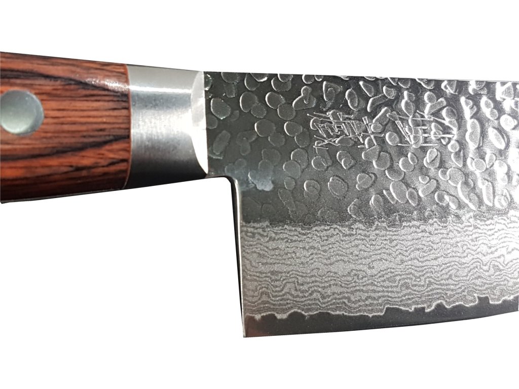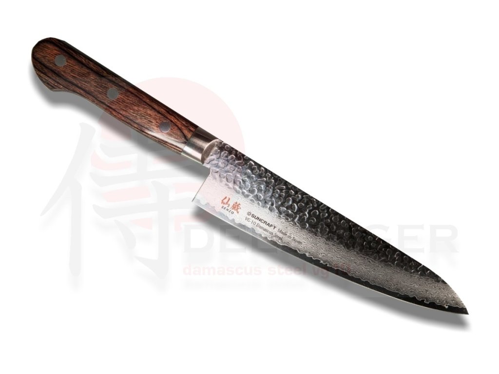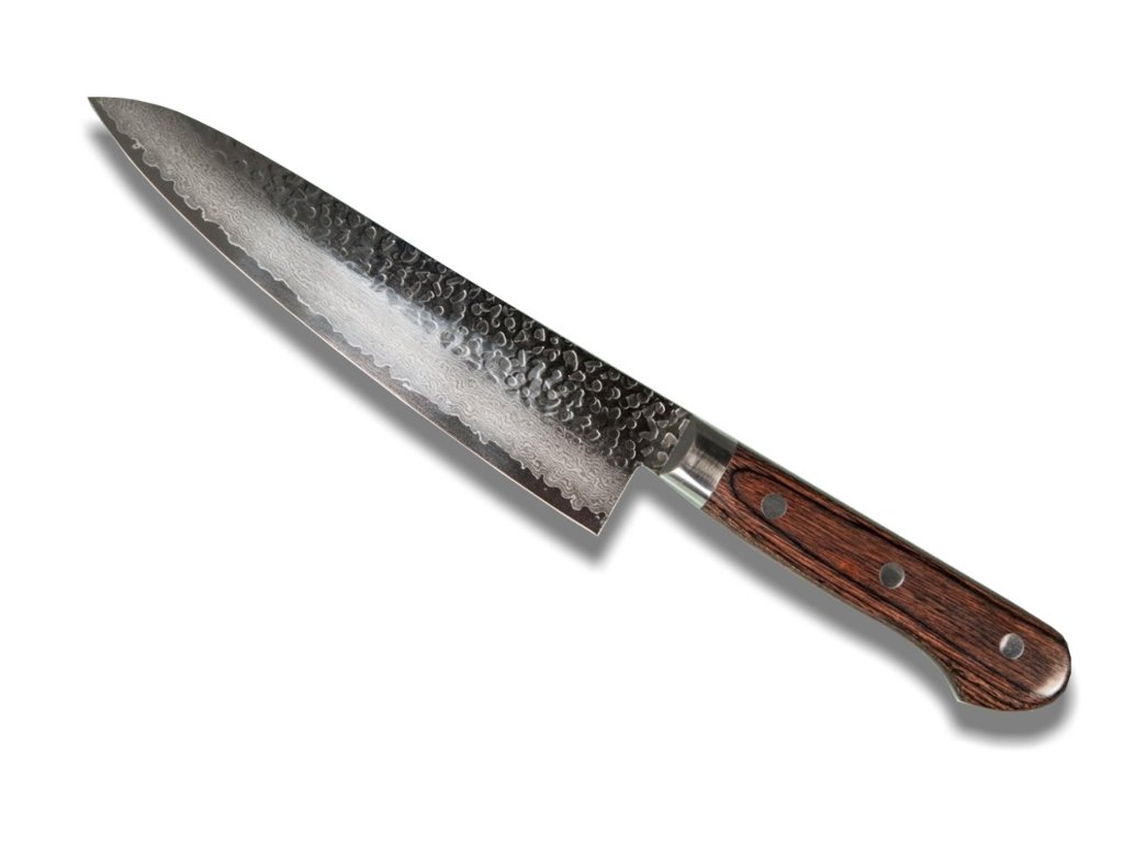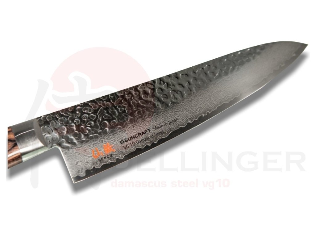 Extrémně ostrý japonský nůž Gyuto/Chef ze série Suncraft Senzo Universal Tsuchime Damascus s jádrem z oceli VG-10 vloženým mezi 66 vrstev damaškové oceli. Hřbet nože a ostří se zužují do špičky pro všestranné využití mimořádné řezné síly. Krájení, plátkování, čištění masa, ovoce a zeleniny – nic nebude pro tento jedinečný nůž japonského tvaru problémem. Kuchařský nůž Gyuto je díky výše položenému hrotu vhodný také ke kolébkovému krájení bylinek, zeleniny a ořechů. Dlouhá čepel a rukojeť západního stylu Vám poskytne tu nejlepší kontrolu při řezání a krájení. Japonské umění, preciznost a nové technologie činí tento nůž z damascénské oceli jedinečným a nenapodobitelným.
