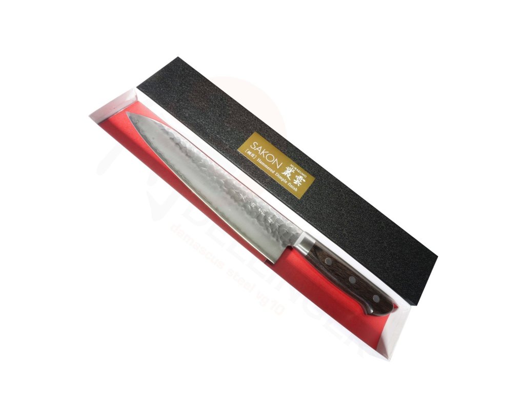 Japonský nůž Gyuto/Chef ze série Hokiyama Sakon Murakumo Tsuchime s extra ostrým jádrem z oceli AUS8, vloženým mezi 3 vrstvy damaškové oceli. Délka ostří 210 mm.