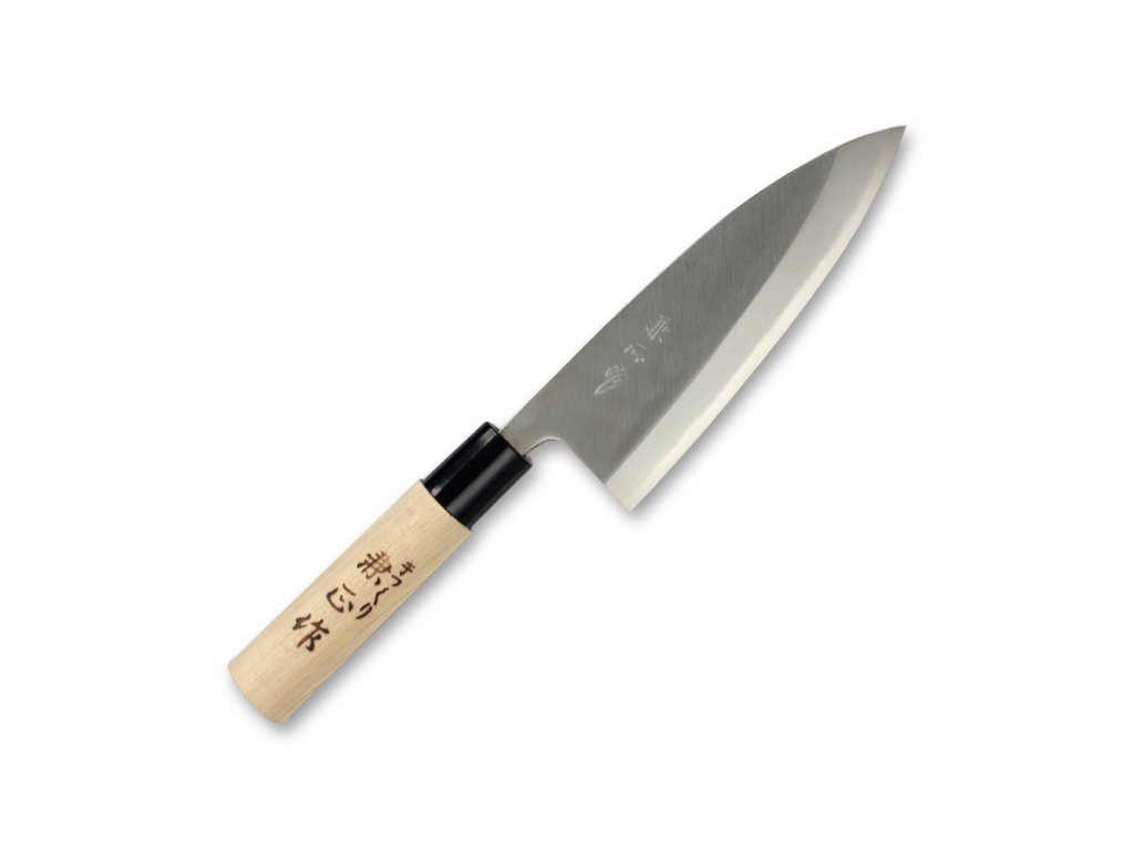 Vysoce kvalitní kuchyňské nože v japonském stylu pro profesionální použití. Deba- tyto nože mají silnou čepel a pokud tento typ nože neznáte, budete překvapeni jeho vahou. Jde o tradiční japonský nůž, jehož ergonomie je uzpůsobena pro porcování a filetování ryb. Nože Deba jsou broušeny z jedné strany a druhá strana má vždy dutý výbrus – tzv. „Ura“ . Tato konstrukce umožňuje právě i silným nožem krájet slabé plátky. Broušení je u jednostranně broušených nožů složitější, proto jsou určeny pro zkušenější uživatele. Konstrukce nože tvoří jádro, které je vyrobeno z kované oceli Hitachi White #3 (Shirogami #3) což je velmi čistá uhlíková ocel s tvrdostí 60-61 HRC. Tyto nože lze opakovaně brousit do velmi jemného ostří.